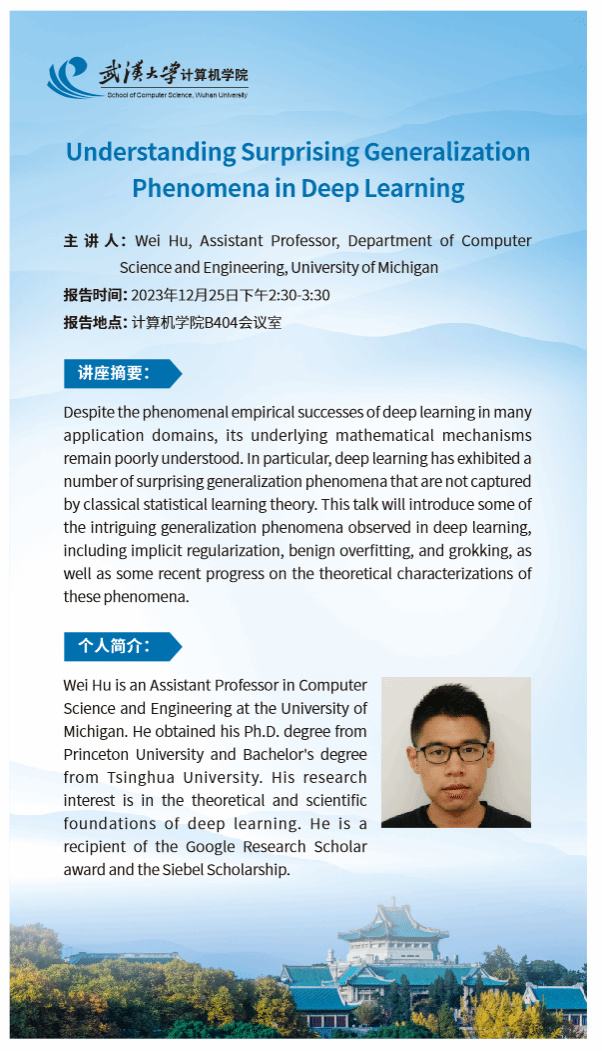 报告人简介:Wei Hu is an Assistant Professor in Computer Science and Engineering at the University of Michigan. He obtained his Ph.D. degree from Princeton University and Bachelor's degree from Tsinghua University. His research interest is in the theoretical and scientific foundations of deep learning. He is a recipient of the Google Research Scholar award and the Siebel Scholarship.