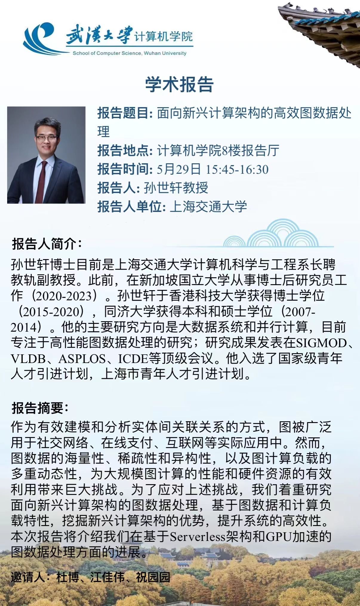 作为有效建模和分析实体间关联关系的方式,图被广泛用于社交网络、在线支付、互联网等实际应用中。然而,图数据的海量性、稀疏性和异构性,以及图计算负载的多重动态性,为大规模图计算的性能和硬件资源的有效利用带来巨大挑战。为了应对上述挑战,我们着重研究面向新兴计算架构的图数据处理,基于图数据和计算负载特性,挖掘新兴计算架构的优势,提升系统的高效性。本次报告将介绍我们在基于Serverless架构和GPU加速的图数据处理方面的进展。
