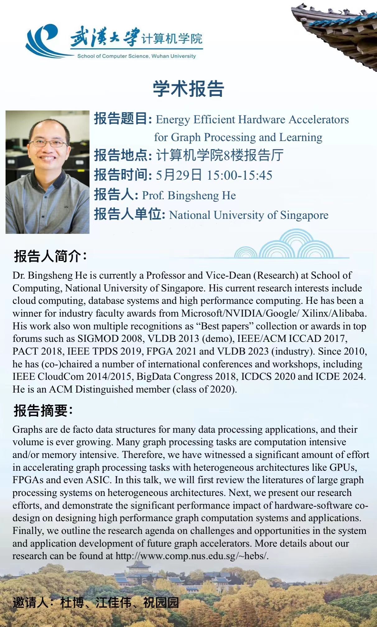Dr. Bingsheng He is currently a Professor and Vice-Dean (Research) at School of Computing, National University of Singapore. His current research interests include cloud computing, database systems and high performance computing. He has been a winner for industry faculty awards from Microsoft/NVIDIA/Google/ Xilinx/Alibaba. His work also won multiple recognitions as “Best papers” collection or awards in top forums such as SIGMOD 2008, VLDB 2013 (demo), IEEE/ACM ICCAD 2017, PACT 2018, IEEE TPDS 2019, FPGA 2021 and VLDB 2023 (industry). Since 2010, he has (co-)chaired a number of international conferences and workshops, including IEEE CloudCom 2014/2015, BigData Congress 2018, ICDCS 2020 and ICDE 2024. He is an ACM Distinguished member (class of 2020).