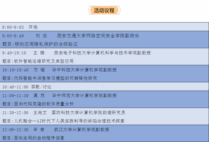 报告人简介:万瑶,博士,华中科技大学副教授,2019年获得浙江大学计算机科学与技术专业博士学位。曾于2016年和2018年分别访问悉尼科技大学与伊利诺伊大学芝加哥分校。主要研究基于自然语言处理和程序分析的代码智能技术。在ICSE、FSE、ASE、ISSTA、SIGMOD、ICML、ICLR、ACL、EMNLP、NAACL等软件工程和人工智能顶级会议发表论文20余篇。担任ARR审稿系统领域主席,及ISSTA、ACL、EMNLP、NAACL、SIGKDD等国际会议程序委员会委员。