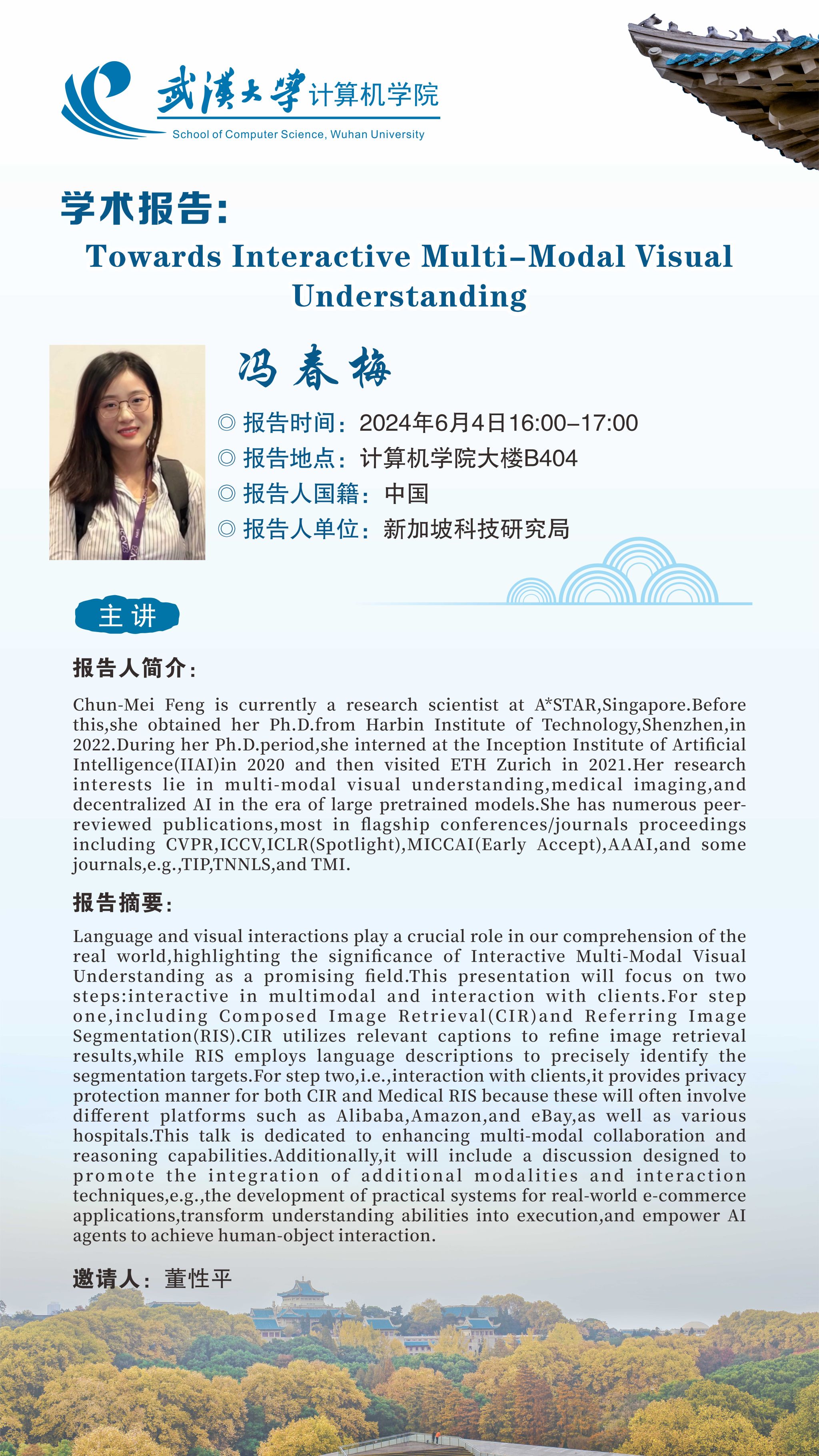 报告人简介:Chun-Mei Feng is currently a research scientist at A*STAR, Singapore. Before this, she obtained her Ph.D. from Harbin Institute of Technology, Shenzhen, in 2022. During her Ph.D. period, she interned at the Inception Institute of Artificial Intelligence (IIAI) in 2020 and then visited ETH Zurich in 2021. Her research interests lie in multi-modal visual understanding, medical imaging, and decentralized AI in the era of large pretrained models. She has numerous peer-reviewed publications, most in flagship conferences/journals proceedings including CVPR, ICCV, ICLR (Spotlight), MICCAI (Early Accept), AAAI, and some journals, e.g., TIP, TNNLS, and TMI.