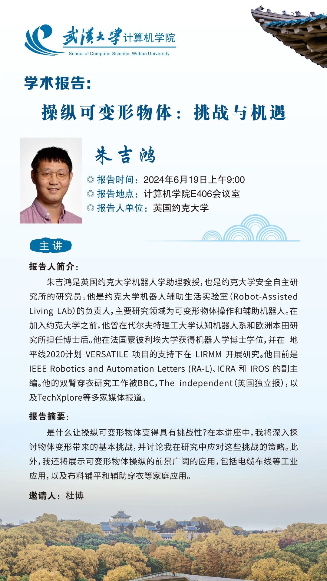 报告人简介:朱吉鸿是英国约克大学机器人学助理教授,也是约克大学安全自主研究所的研究员。他是约克大学机器人辅助生活实验室(Robot-Assisted Living LAb)的负责人,主要研究领域为可变形物体操作和辅助机器人。在加入约克大学之前,他曾在代尔夫特理工大学认知机器人系和欧洲本田研究所担任博士后。他在法国蒙彼利埃大学获得机器人学博士学位,并在 地平线2020计划 VERSATILE 项目的支持下在 LIRMM 开展研究。他目前是 IEEE Robotics and Automation Letters (RA-L)、ICRA 和 IROS 的副主编。他的双臂穿衣研究工作被BBC,The independent(英国独立报),以及TechXplore等多家媒体报道。