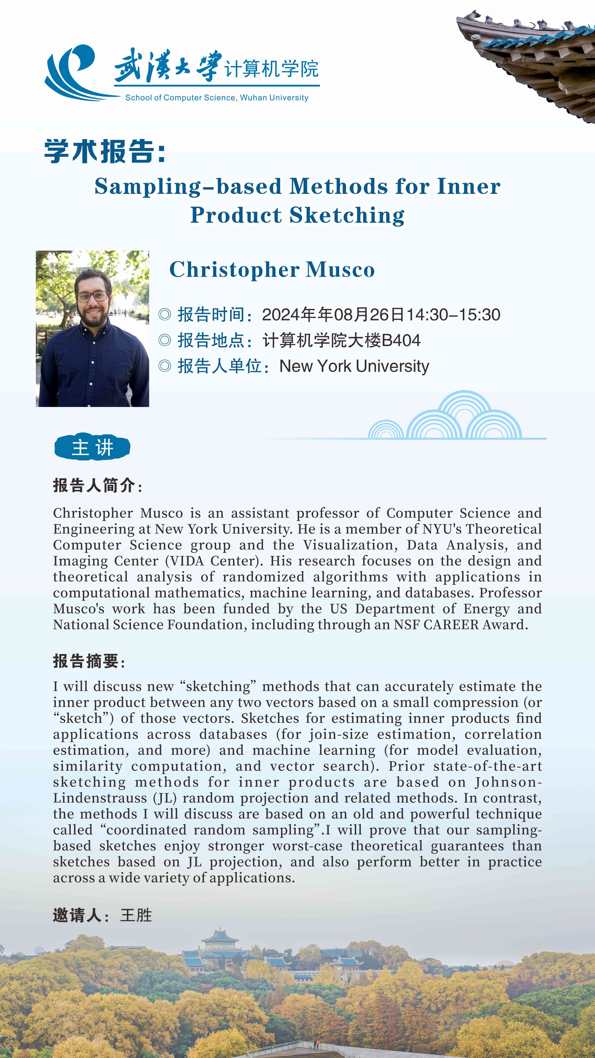 报告人简介:Christopher Musco is an assistant professor of Computer Science and Engineering at New York University. He is a member of NYU's Theoretical Computer Science group and the Visualization, Data Analysis, and Imaging Center (VIDA Center). His research focuses on the design and theoretical analysis of randomized algorithms with applications in computational mathematics, machine learning, and databases. Professor Musco's work has been funded by the US Department of Energy and National Science Foundation, including through an NSF CAREER Award.