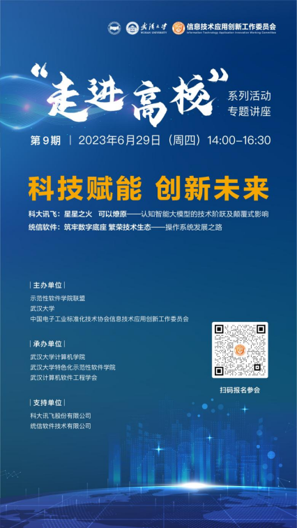 2023629日(星期四),学院举办“信创”技术报告会,来自科大讯飞、统信软件的专家,围绕软硬件自主化,介绍先进思想和技术。报告会中也会介绍企业就业相关信息。欢迎老师、同学参加。有意参加的同学,请扫码报名。