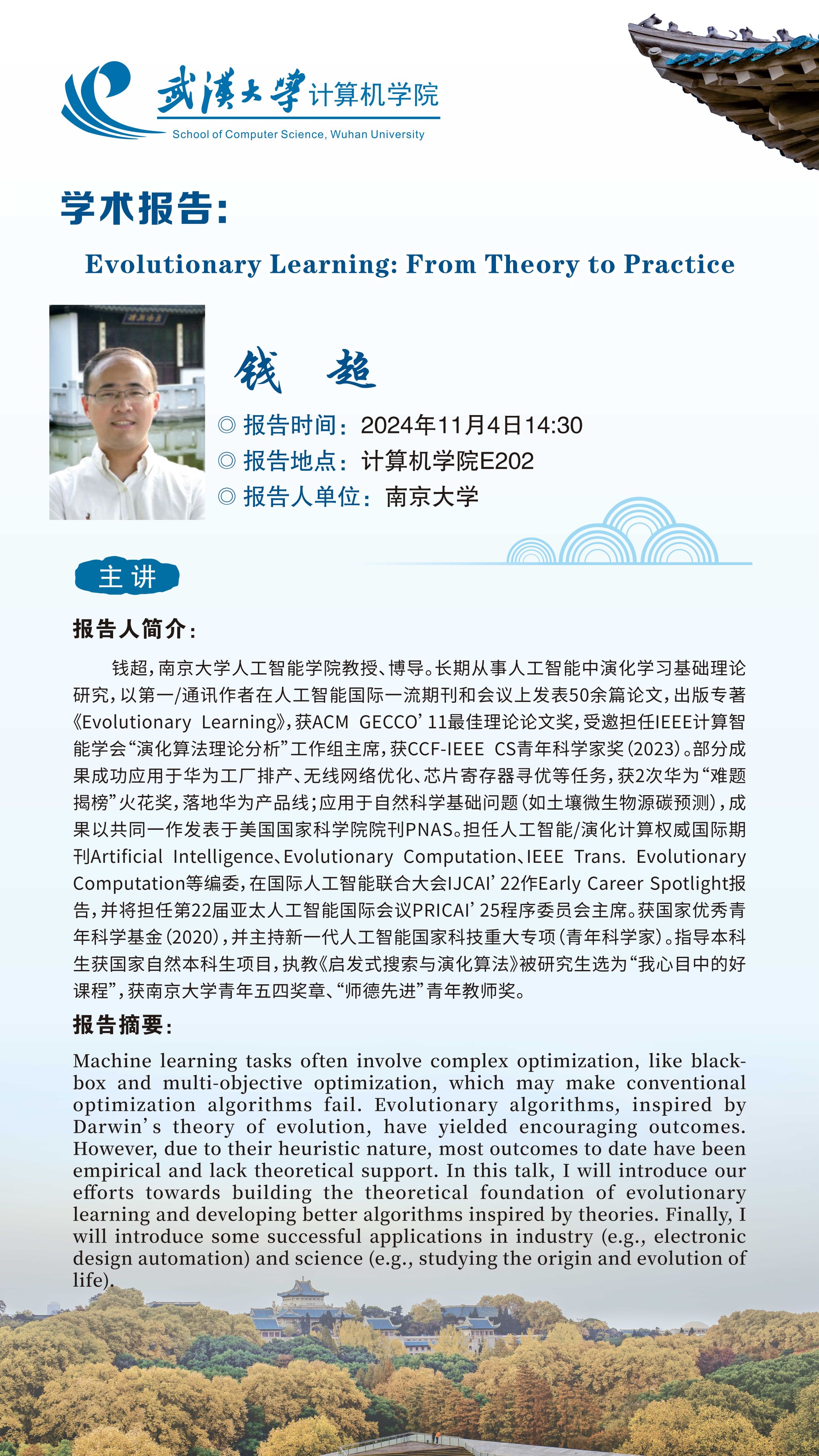 报告人简介:钱超,南京大学人工智能学院教授博导。长期从事人工智能中演化学习基础理论研究,以第一/通讯作者在人工智能国际一流期刊和会议上发表50余篇论文,出版专著Evolutionary LearningACM GECCO’11最佳理论论文奖,受邀担任IEEE计算智能学会“演化算法理论分析”工作组主席,获CCF-IEEE CS青年科学家奖2023)。部分成果成功应用于华为工厂排产、无线网络优化、芯片寄存器寻优等任务,获2次华为难题揭榜火花奖落地华为产品线;应用于自然科学基础问题(如土壤微生物源碳预测),成果以共同一作发表于美国国家科学院院刊PNAS。担任人工智能/演化计算权威国际期刊Artificial IntelligenceEvolutionary ComputationIEEE Trans. Evolutionary Computation等编委在国际人工智能联合大会IJCAI’22Early Career Spotlight报告,并将担任第22届亚太人工智能国际会议PRICAI25程序委员会主席。获国家优秀青年科学基金(2020,并主持新一代人工智能国家科技重大专项(青年科学家)指导本科生获国自然本科生项目,执教《启发式搜索与演化算法》被研究生选为我心目中的好课程,获南京大学青年五四奖章、师德先进青年教师奖