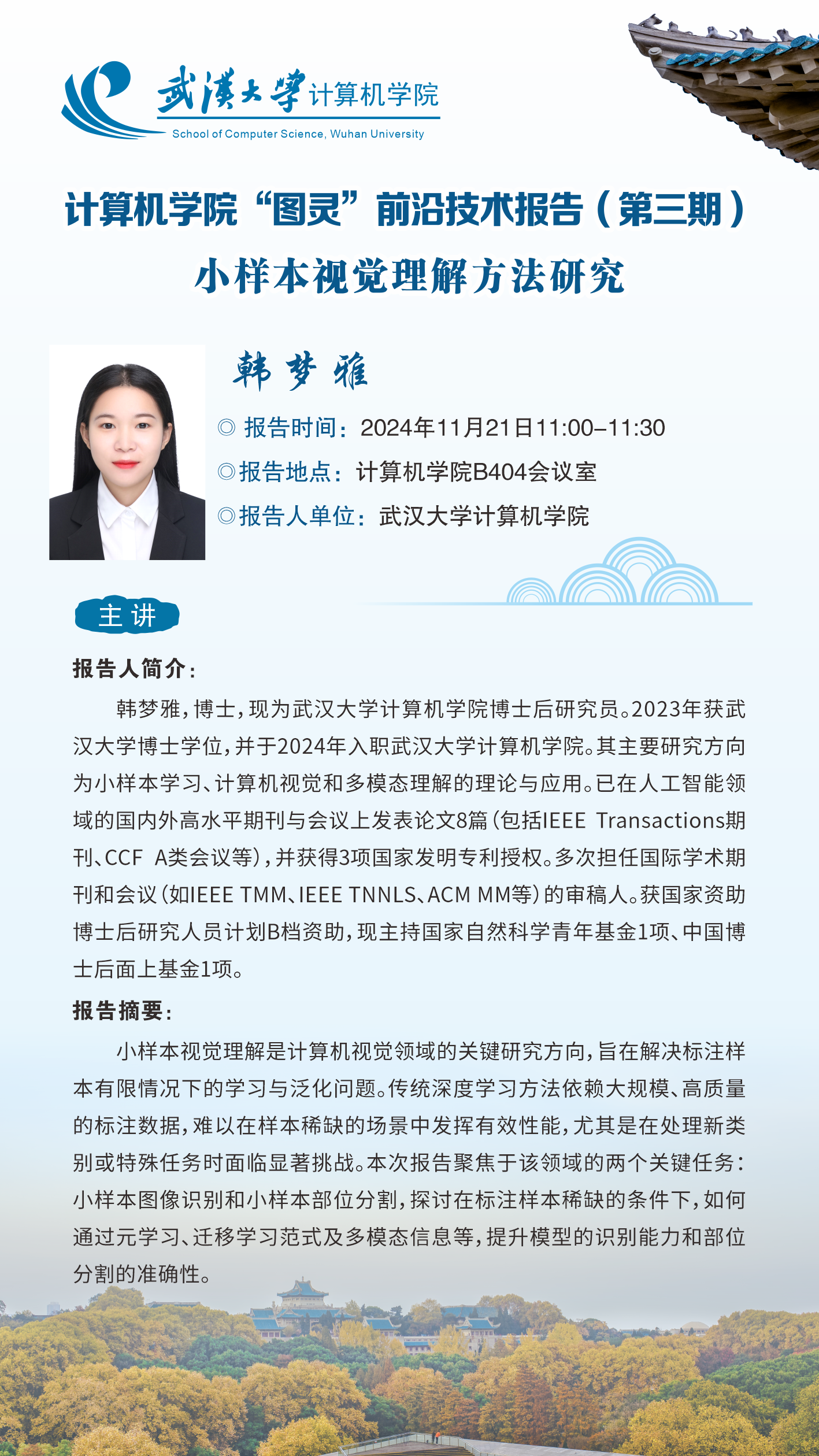 报告人简介:韩梦雅,博士,现为K体育·(sports)官方网站博士后研究员。2023年获武汉大学博士学位,并于2024年入职K体育·(sports)官方网站。其主要研究方向为小样本学习、计算机视觉和多模态理解的理论与应用。已在人工智能领域的国内外高水平期刊与会议上发表论文8篇(包括IEEE Transactions期刊、CCF A类会议等),并获得3项国家发明专利授权。多次担任国际学术期刊和会议(如IEEE TMM、IEEE TNNLS、ACM MM等)的审稿人。获国家资助博士后研究人员计划B档资助,现主持国家自然科学青年基金1项、中国博士后面上基金1项。