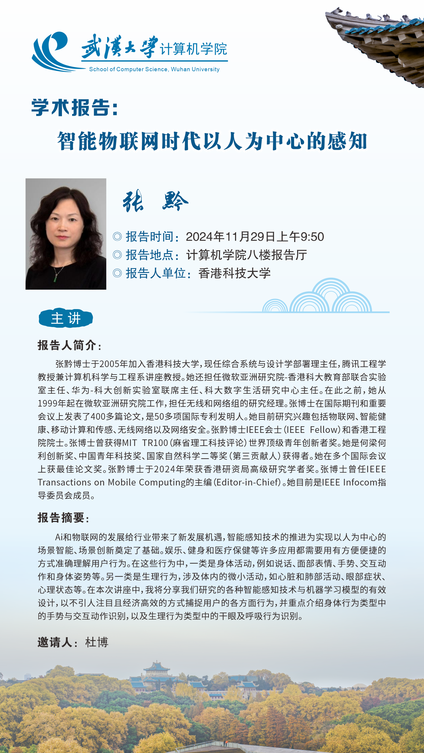 报告人简介:张黔博士于2005年加入香港科技大学,现任综合系统与设计学部署理主任,腾讯工程学教授兼计算机科学与工程系讲座教授。她还担任微软亚洲研究院-香港科大教育部联合实验室主任、华为-科大创新实验室联席主任、科大数字生活研究中心主任。在此之前,她从 1999 年起在微软亚洲研究院工作,担任无线和网络组的研究经理。张博士在国际期刊和重要会议上发表了400多篇论文,是50多项国际专利发明人。她目前研究兴趣包括物联网、智能健康、移动计算和传感、无线网络以及网络安全。张黔博士 IEEE 会士(IEEE Fellow)和香港工程院院士。张博士曾获得MIT TR100(麻省理工科技评论)世界顶级青年创新者奖。她是何梁何利创新奖、中国青年科技奖、国家自然科学二等奖(第三贡献人)获得者。她在多个国际会议上获最佳论文奖。张黔博士于2024年荣获香港研资局高级研究学者奖。张博士曾任IEEE Transactions on Mobile Computing的主编(Editor-in-Chief)。她目前是 IEEE Infocom 指导委员会成员。