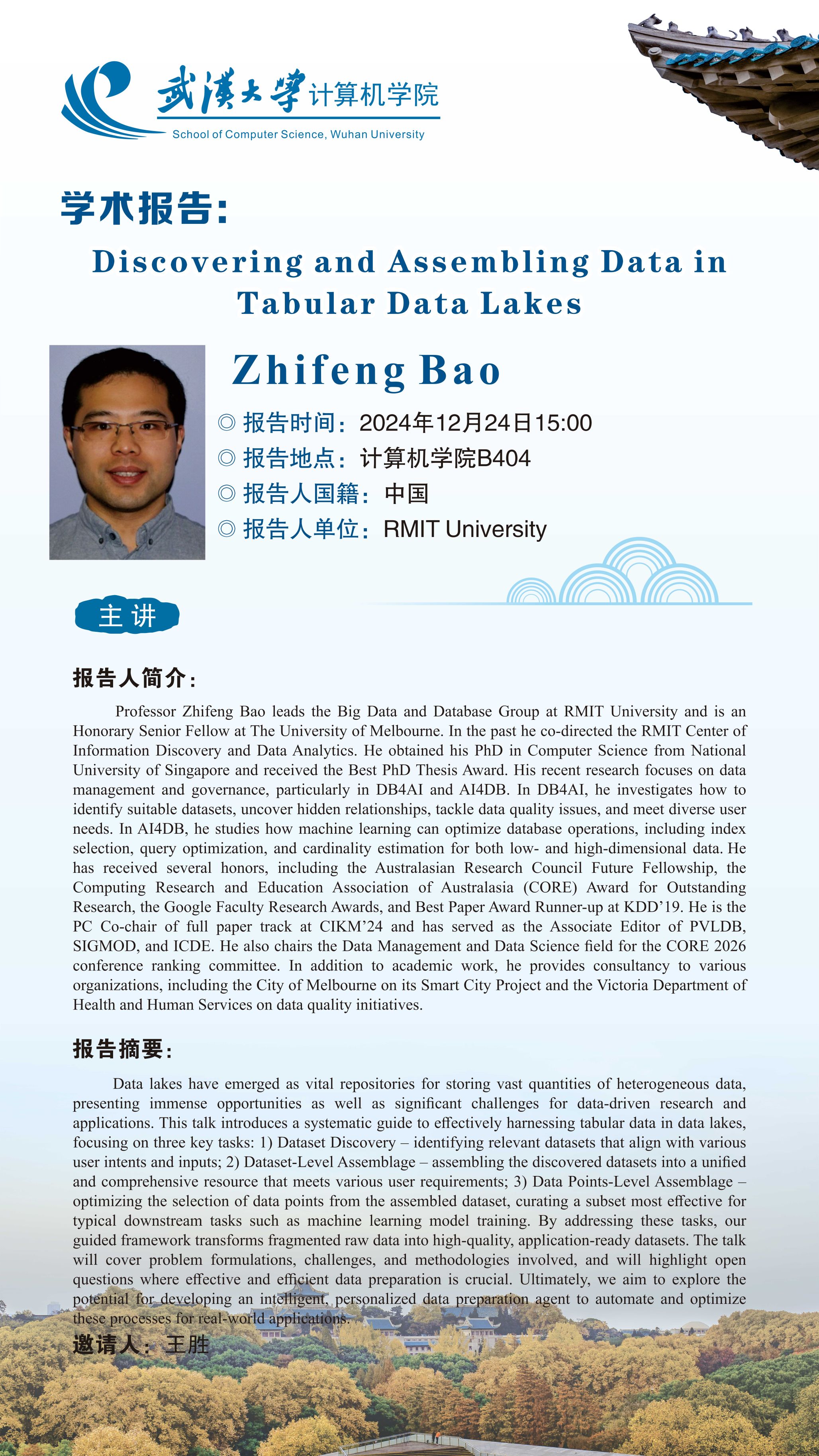 报告人简介:Professor Zhifeng Bao leads the Big Data and Database Group at RMIT University and is an Honorary Senior Fellow at The University of Melbourne. In the past he co-directed the RMIT Center of Information Discovery and Data Analytics. He obtained his PhD in Computer Science from National University of Singapore and received the Best PhD Thesis Award. His recent research focuses on data management and governance, particularly in DB4AI and AI4DB. In DB4AI, he investigates how to identify suitable datasets, uncover hidden relationships, tackle data quality issues, and meet diverse user needs. In AI4DB, he studies how machine learning can optimize database operations, including index selection, query optimization, and cardinality estimation for both low- and high-dimensional data. He has received several honors, including the Australasian Research Council Future Fellowship, the Computing Research and Education Association of Australasia (CORE) Award for Outstanding Research, the Google Faculty Research Awards, and Best Paper Award Runner-up at KDD’19. He is the PC Co-chair of full paper track at CIKM’24 and has served as the Associate Editor of PVLDB, SIGMOD, and ICDE. He also chairs the Data Management and Data Science field for the CORE 2026 conference ranking committee. In addition to academic work, he provides consultancy to various organizations, including the City of Melbourne on its Smart City Project and the Victoria Department of Health and Human Services on data quality initiatives.