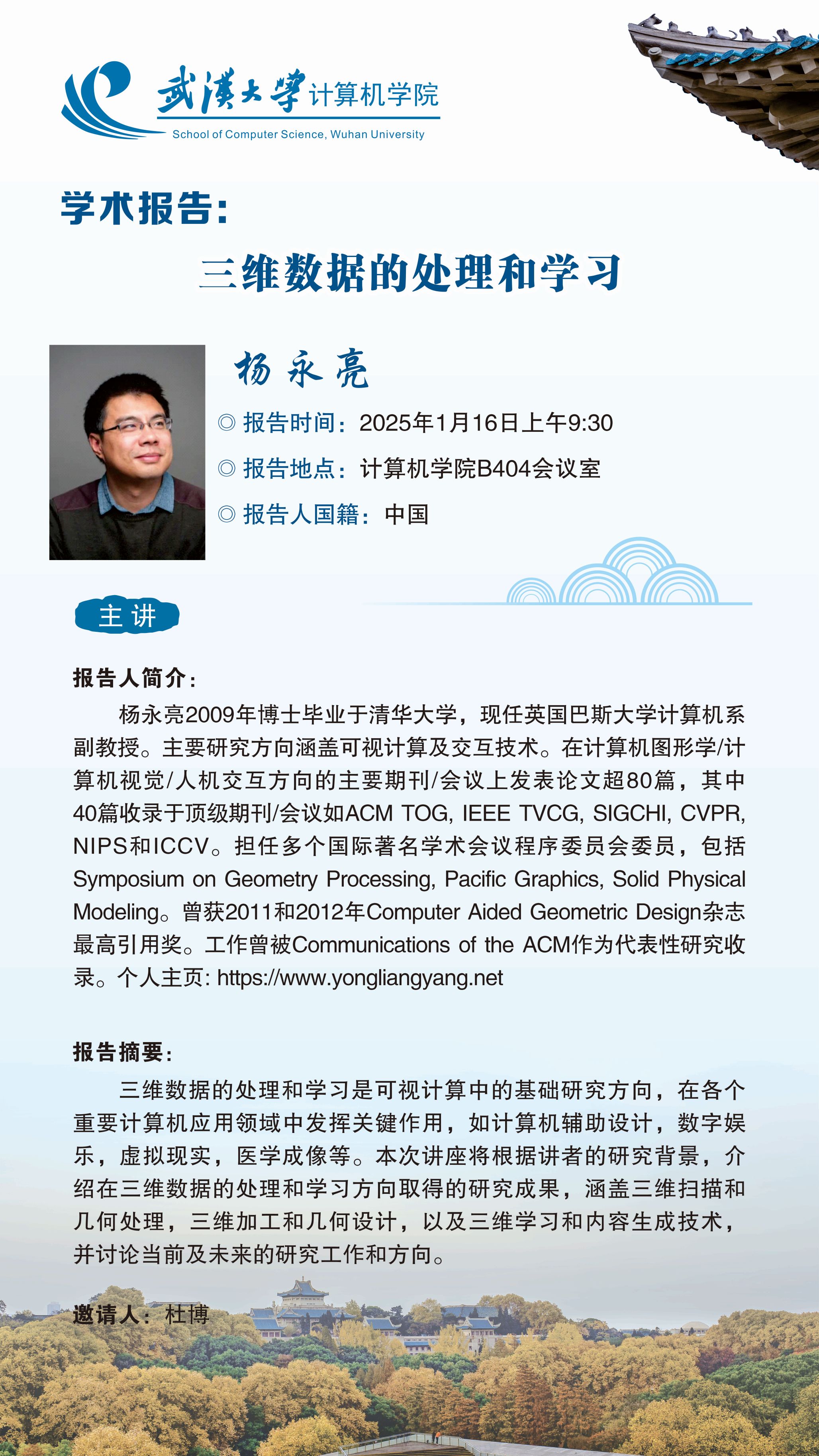 杨永亮2009年博士毕业于清华大学,现任英国巴斯大学计算机系副教授。主要研究方向涵盖可视计算及交互技术。在计算机图形学/计算机视觉/人机交互方向的主要期刊/会议上发表论文超80篇,其中40篇收录于顶级期刊/会议如ACM TOG, IEEE TVCG, SIGCHI, CVPR, NIPS和ICCV。担任多个国际著名学术会议程序委员会委员,包括Symposium on Geometry Processing, Pacific Graphics, Solid Physical Modeling。曾获2011和2012年Computer Aided Geometric Design杂志最高引用奖。工作曾被Communications of the ACM作为代表性研究收录。个人主页: https://www.yongliangyang.net
