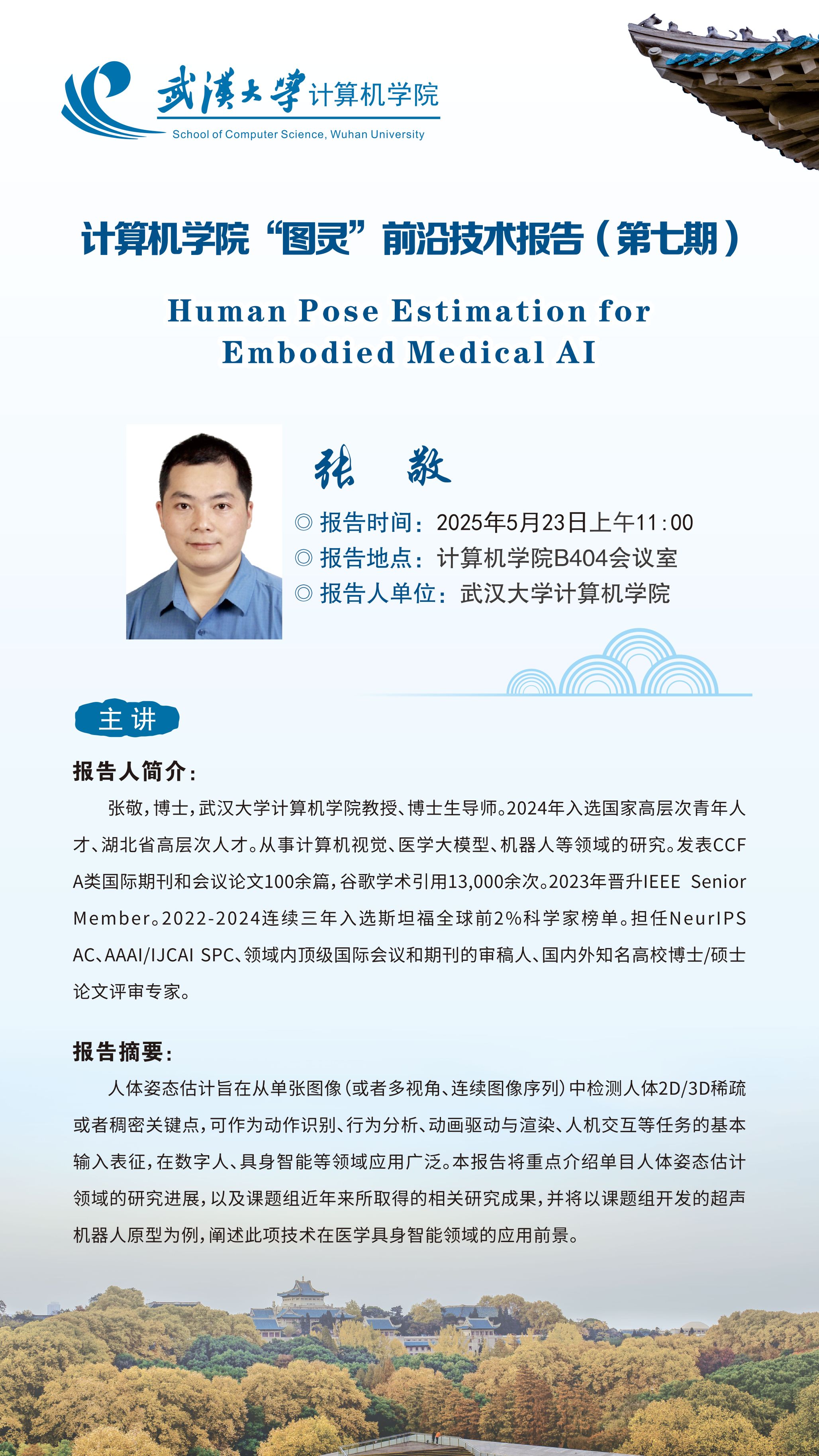 报告摘要:人体姿态估计旨在从单张图像(或者多视角、连续图像序列)中检测人体2D/3D稀疏或者稠密关键点,可作为动作识别、行为分析、动画驱动与渲染、人机交互等任务的基本输入表征,在数字人、具身智能等领域应用广泛。本报告将重点介绍单目人体姿态估计领域的研究进展,以及课题组近年来所取得的相关研究成果,并将以课题组开发的超声机器人原型为例,阐述此项技术在医学具身智能领域的应用前景。