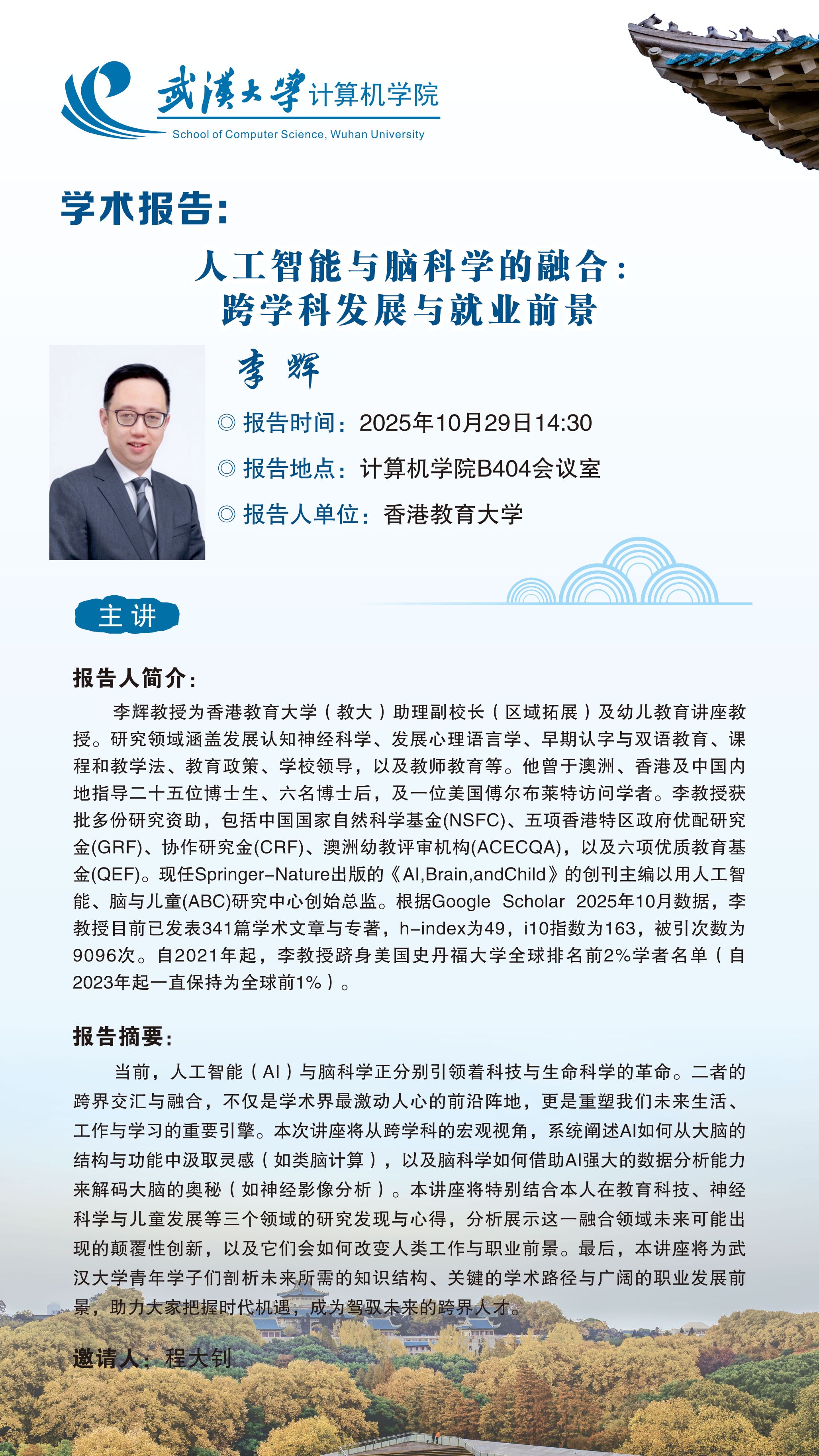 报告摘要:当前,人工智能(AI)与脑科学正分别引领着科技与生命科学的革命。二者的跨界交汇与融合,不仅是学术界最激动人心的前沿阵地,更是重塑我们未来生活、工作与学习的重要引擎。本次讲座将从跨学科的宏观视角,系统阐述AI如何从大脑的结构与功能中汲取灵感(如类脑计算),以及脑科学如何借助AI强大的数据分析能力来解码大脑的奥秘(如神经影像分析)。本讲座将特别结合本人在教育科技、神经科学与儿童发展等三个领域的研究发现与心得,分析展示这一融合领域未来可能出现的颠覆性创新,以及它们会如何改变人类工作与职业前景。最后,本讲座将为武汉大学青年学子们剖析未来所需的知识结构、关键的学术路径与广阔的职业发展前景,助力大家把握时代机遇,成为驾驭未来的跨界人才。
