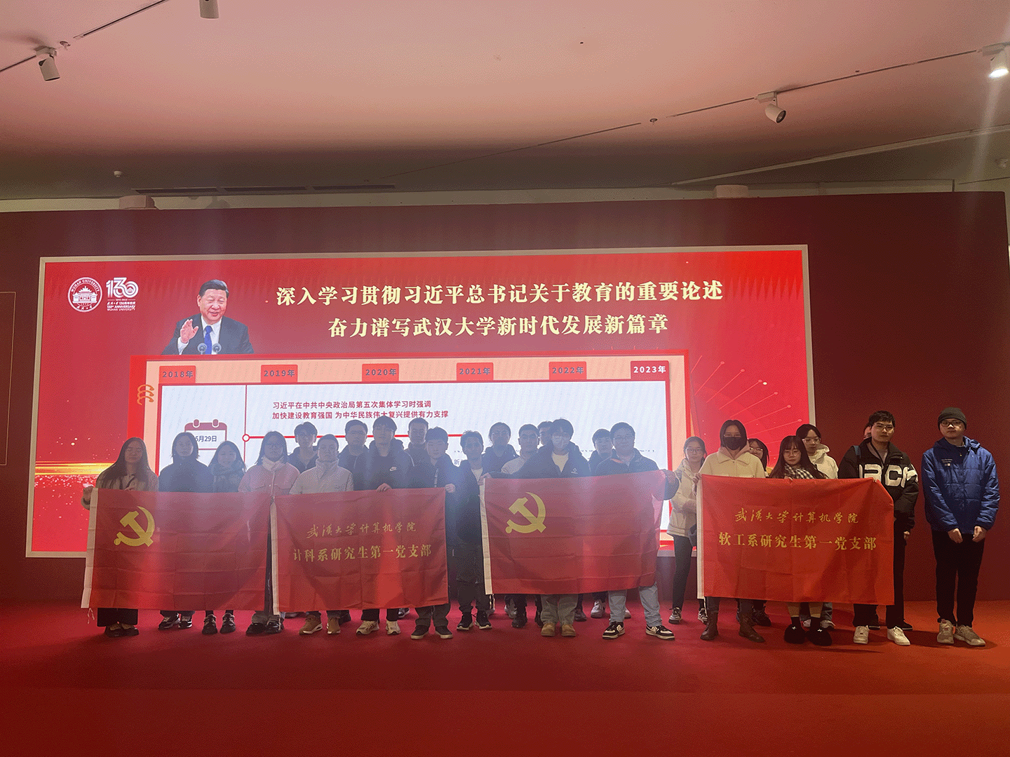 计算机学院基础软件实验室研究生党支部、计科系研究生第一党支部、软工系研究生第一党支部、七楼实验室研究生党支部组织了本支部研究生党员前往万林艺术博物馆参观“武汉大学新时代办学成就展”,深入了解武汉大学办学成就。参观过程中,武汉大学连续三年获得国家科技进步奖一等奖、三颗卫星的成功发射、82个专业获批一流本科专业、入选国家第二轮“双一流”的顶尖学科、人工智能机器人以及抗疫贡献等等都深深触动了大家!同志们纷纷表示,随着计算机科学的持续发展,武汉大学的发展更加日新月异,“自强弘毅、求是拓新”的珞珈精神会持续引领我们不断进步。
