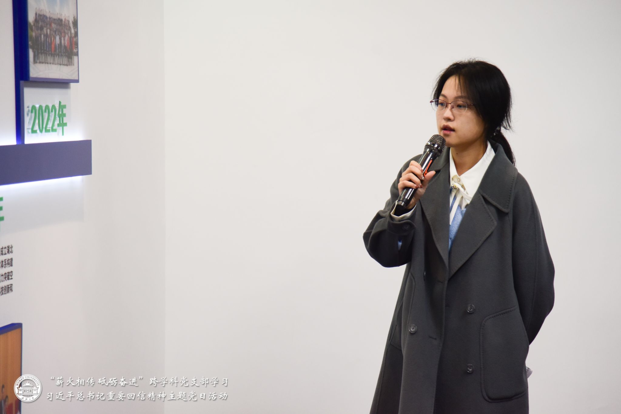 各党支部代表依次上台发言,讲述自己对习近平总书记回信精神的感悟。博士研究生党支部书记李柳春同志表示,作为计科学子要以时不我待的责任感和使命感,自立自强,催生创新成果,树立武大旗帜,切实攻克极地研究的“卡脖子”技术难题,矢志不渝勇攀科学高峰;要不断拓宽思维视野,完善业务能力,以个人行动践行心怀“国之大者”,为这份时代重任贡献力量。2023级研究生党支部书记胡宗田结合近期“凝练计科精神”“奋进长征精神”“重要回信精神”的系列学习感悟,表达了作为一名人工智能方向的博士生党员,理应厚植家国情怀、坚定“四个自信”,抓住创新机遇、勇攀科技高峰,在建设科技强国与全面推进中国式现代化的伟大实践中书写青春华章。