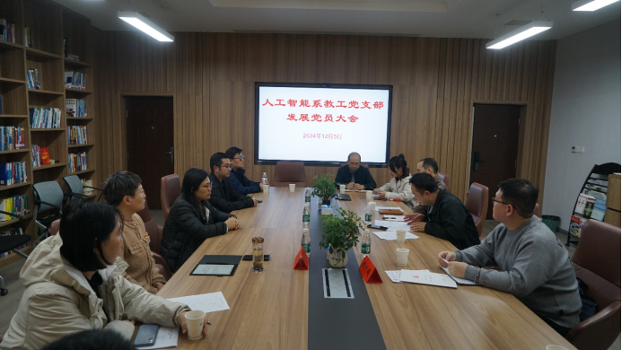 2024年12月5日下午,人工智能系教工党支部召开党员发展大会,讨论接收胡则超同志为中共预备党员,会议由邹华同志主持,学院纪委书记杨晓岚、人工智能系教工党支部全体党员参加大会。