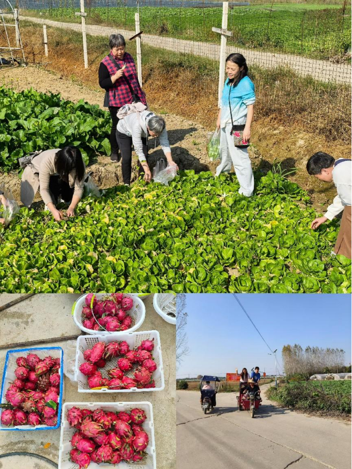 下午,老师们来到火龙果基地开展采摘活动。果园里一片丰收景象:红红火火的果实、绿油油的蔬菜与五彩斑斓的树叶相互映衬,美不胜收。一走进果园,教师们就被那挂满枝头的火龙果吸引,果香四溢,弥漫在每一寸空气中,仿佛是大自然发出的甜蜜邀请。大家一边感受着果实的饱满,一边分享着采摘技巧,欢声笑语回荡在果园。半日的劳作,一袋袋的火龙果、青菜、土萝卜等被收入囊中。沉甸甸的劳动成果,让老师们收获了满满的幸福。随着夕阳西下,秋游活动在欢声笑语中圆满结束。