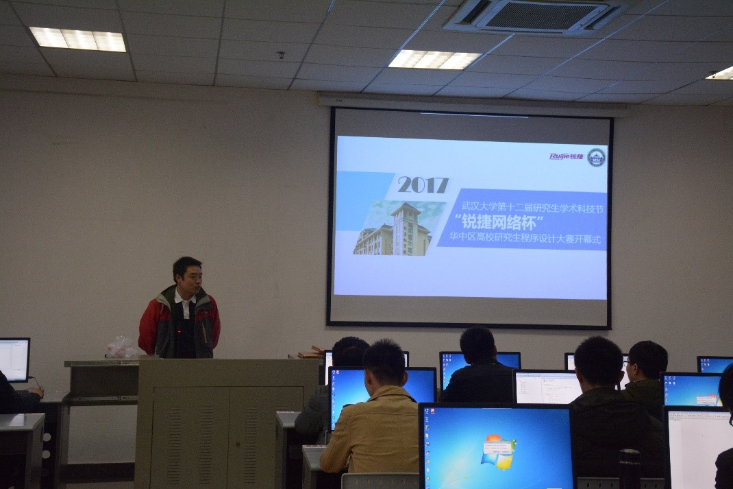 2017年12月3日, 武汉大学第十二届研究生学术科技节之“锐捷网络杯”华中区高校研究生程序设计大赛在计算机学院B303圆满落幕。锐捷网络有限公司人力资源部总监徐江先生,武汉大学ACM协会指导老师董文勇教授,计算机学院学生工作办公室副主任潘艳老师出席了开幕式,徐总致开幕词。