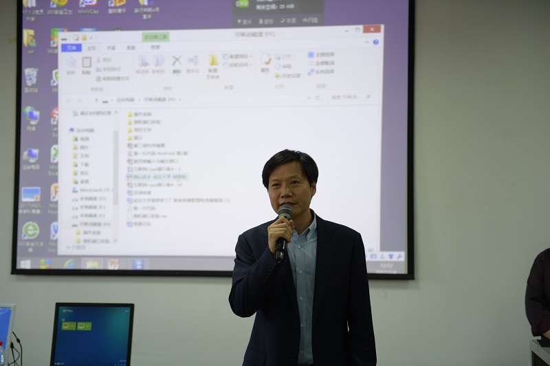 会议期间,“武汉大学杰出校友”雷军和他的团队——小米科技、金山软件、顺为资本的20多位高管来到大会现场,现场掌声雷动,彻底点燃现场学子热情。雷军得知正在召开的是“互联网+”大学生创新创业大赛推进专题辅导会时,欣然拿起话筒作了简短动员讲话:“30年前,我和你们一样初入校园,憧憬着美好的未来;得知你们连续两届获得‘互联网+’大赛金奖,希望你们再接再厉,再获金奖。未来是属于你们的,相信你们一定会比我做得更大更强”。讲话结束后,雷军还与当年读书时的班主任张德向老师进行了亲切交谈。