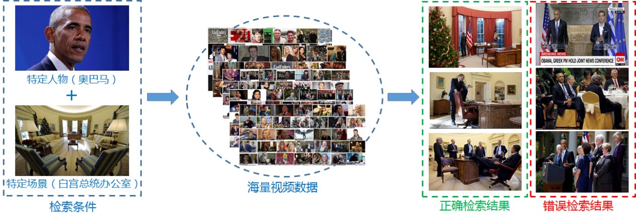 本次实例检索任务要求评测团队从海量视频数据(47万多段视频片断)中检索出某一特定人物在某一特定场景出现的视频片段(见图1),评测任务具有很大的挑战性。评测团队利用多媒体检索、计算机视觉、机器学习等技术对视频内容进行分析与理解,并找出官方规定的评测课题内容,找到越多越准,检索平均准确率越高,被评测系统就越好越先进。这一任务支持用户提出人物和场景两方面的检索条件,评测系统在海量视频中找出同时满足这两个条件的视频片断。比如,用户想从海量视频中获取“奥巴马在白宫总统办公室”的视频,由于“奥巴马”的衣着不一、姿态变化,找到“奥巴马”出现的视频已是不易,系统还需在“奥巴马”出现的众多类似场景中,把在“白宫总统办公室”的那些选出来。