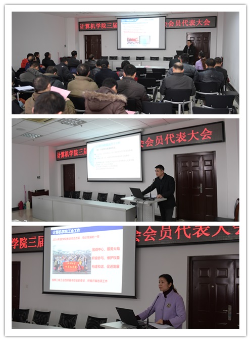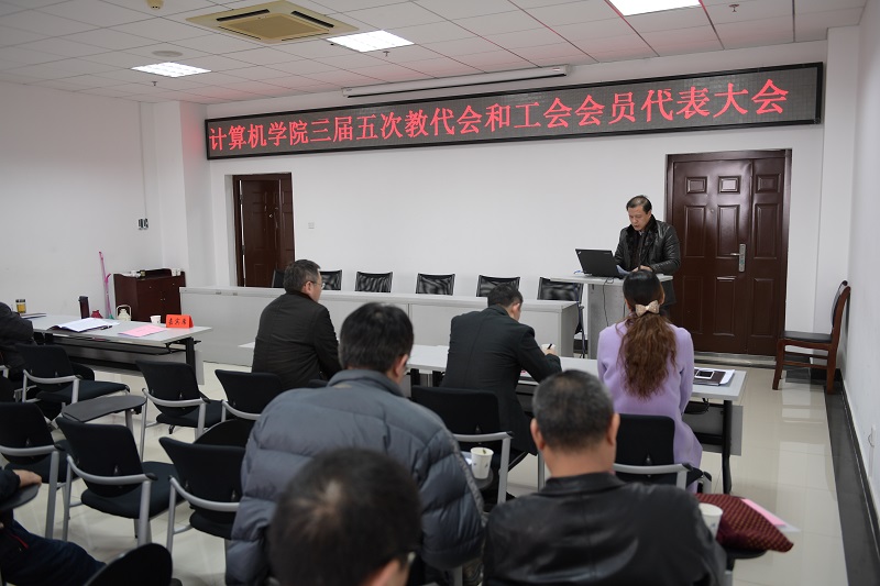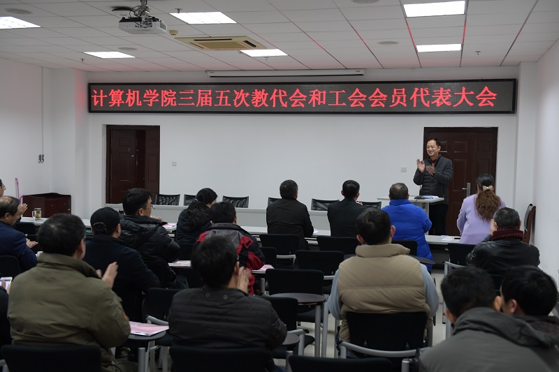 2017年 1月12日下午,计算机学院三届五次教代会和工会会员代表大会在学院B403会议室隆重召开,学院49名代表参加了会议。会议由院党委副书记胡俊英主持。院长胡瑞敏代表院领导班子作2016年工作报告,副院长彭正明作财务工作报告,胡俊英副书记作工会工作报告。
