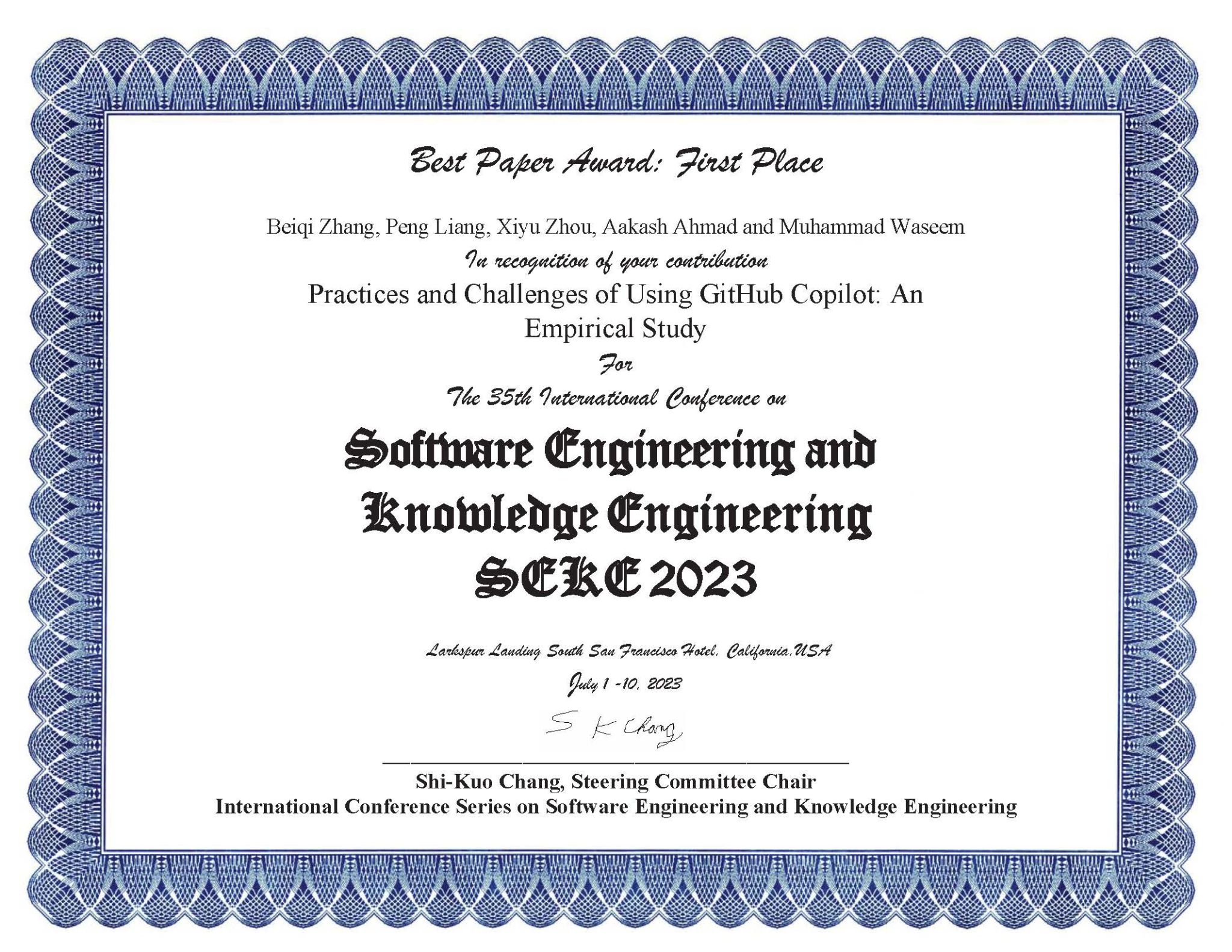 近日,国际软件工程与知识工程大会(International Conference on Software Engineering & Knowledge Engineering, SEKE)于美国旧金山召开并公布了大会奖项。SEKE 2023会议共录用130篇论文,计算机学院智能化软件与服务研究所梁鹏教授团队的论文《Practices and Challenges of Using GitHub Copilot: An Empirical Study》获得了大会颁发的唯一最佳论文奖一等奖(Best Paper Award: First Place)。