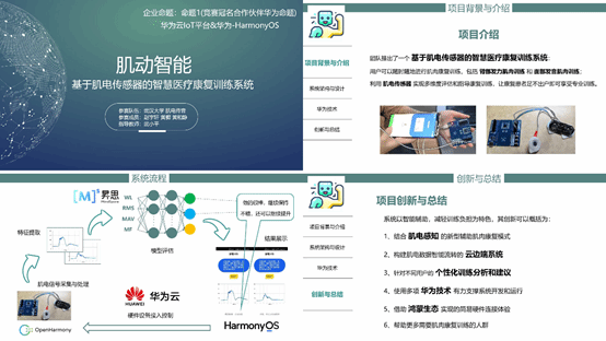 《肌动智能——基于肌电传感器的智慧医疗康复训练系统》项目(指导老师:武小平),关注到构音障碍、肌肉萎缩等肌肉康复患者群体,创新性的将肌电传感器引入居家肌肉康复训练中,利用肌电传感器与人工智能技术实现多维度评估和指导康复训练。系统以智能辅助,减轻训练负担为特色,并利用多项华为技术为用户提供多端互联、交互融合的体验。