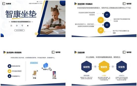 《智康坐垫》项目(指导老师:牛晓光)针对青少年特定用户人群设计了一款智能坐垫。通过压力传感器采集数据并辅以人工智能算法,实现坐姿异常检测、久坐时长记录、专注度识别等功能,可以帮助家长了解并督促解决孩子的坐姿与专注度问题,成为日常健康生活小助手。