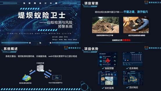 《蚁险卫士-白蚁检测与风险预警系统》项目(指导老师:刘树波、李华玮)以“实时监测,人为介入,风险预警、智能管理”为核心理念,融合多元传感技术、云计算、远程监控等特点,实现了智能预警、低本降耗、实时监测和及时响应的功能,为堤坝蚁患解决带来基于AIoT的新思想新方案。