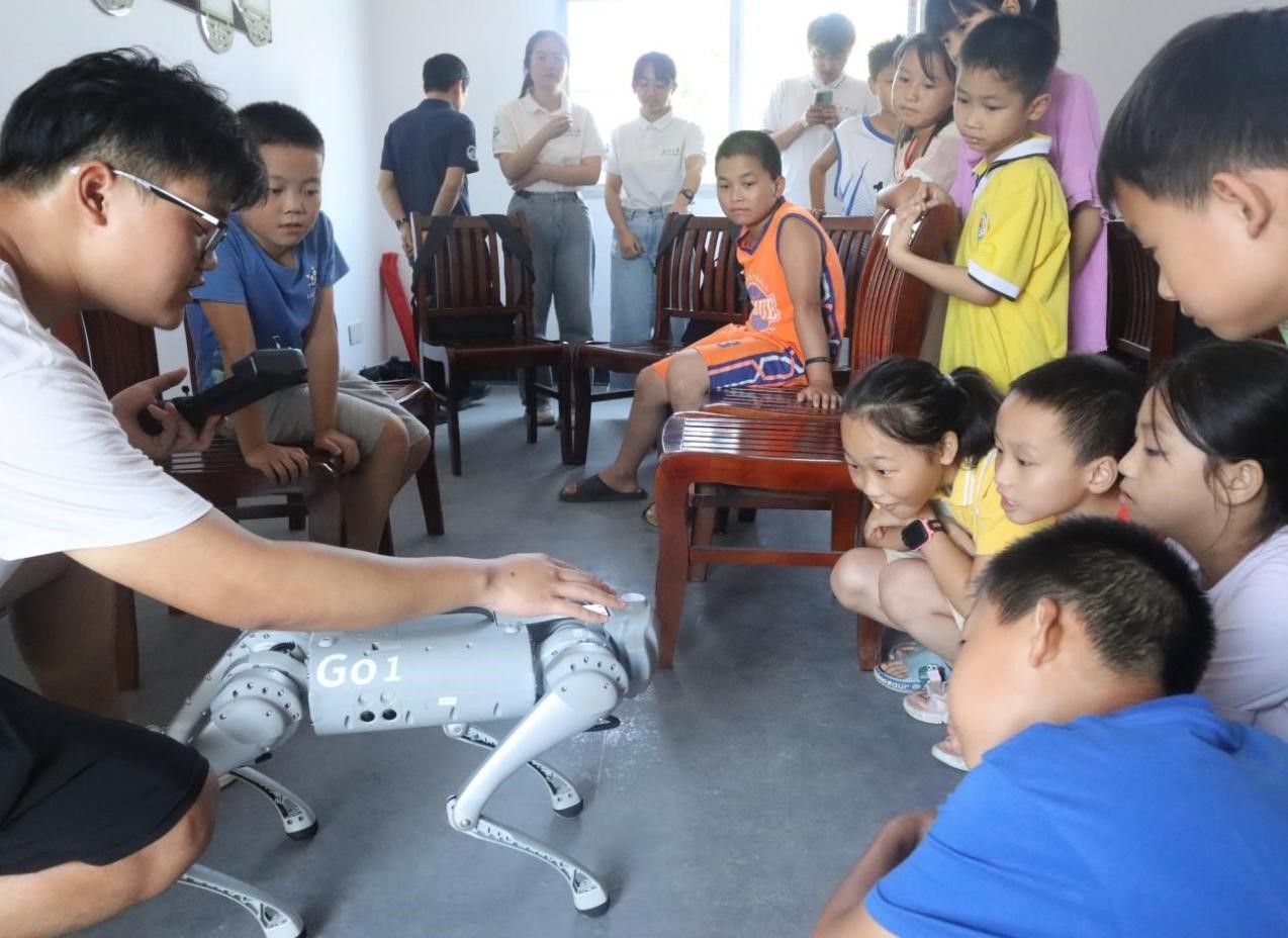 科普燃童心,以行践初心 为更好地响应国家大力建设美好乡村的号召,践行“请党放心,强国有我”的青春誓言,实践队为两地的小学生们开展了科普支教活动。实践队利用机器狗,给同学们讲述了一堂精彩的人工智能课。同学们积极提问、参与互动环节,表现出对新兴技术的向往。支教对于丰富乡村学生的暑假生活,拓宽学生视野意义非凡。