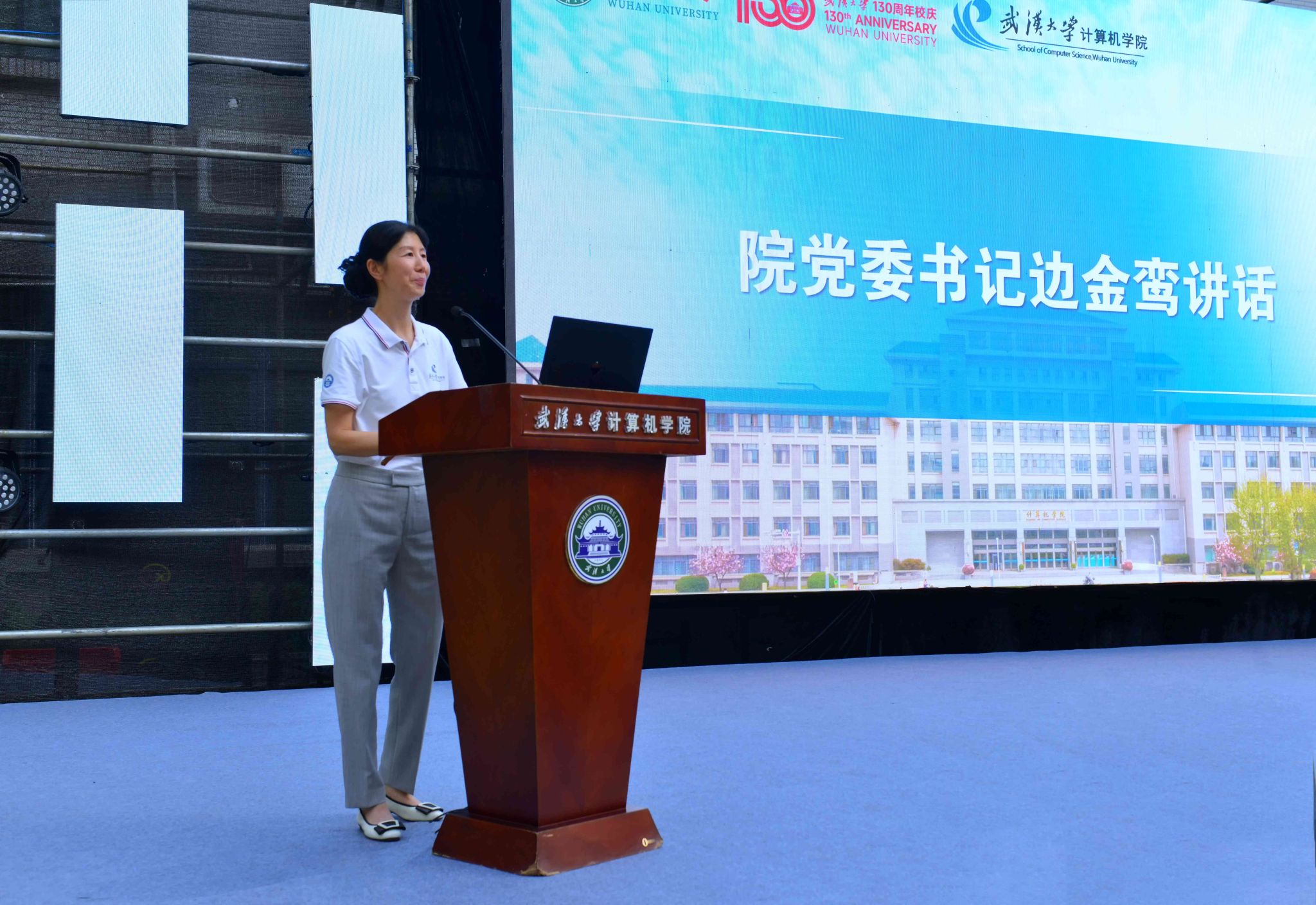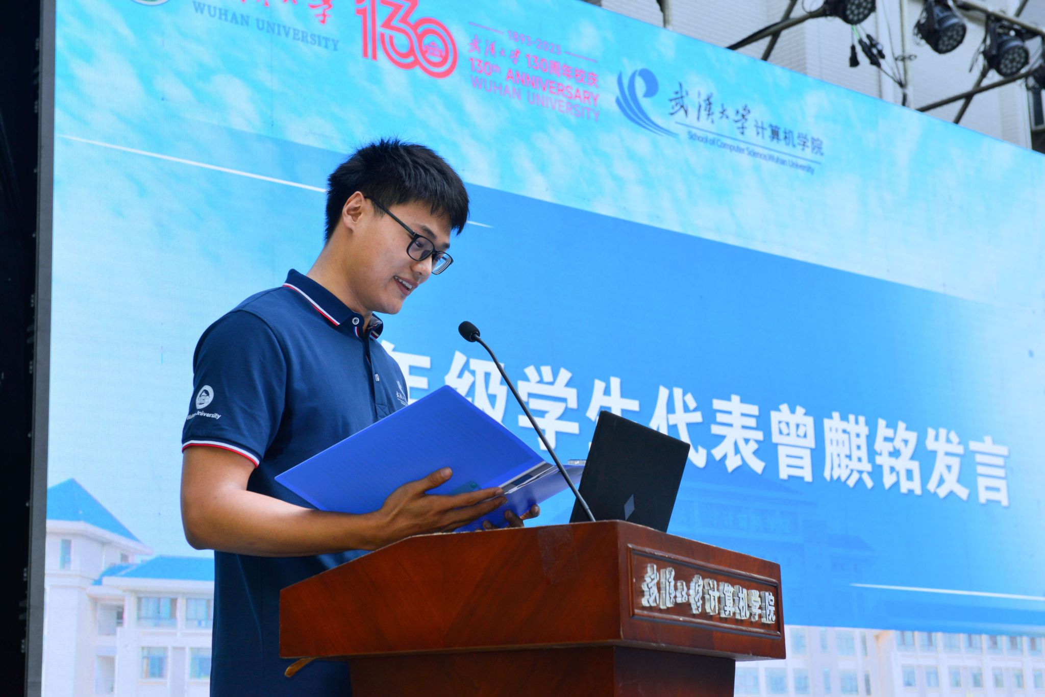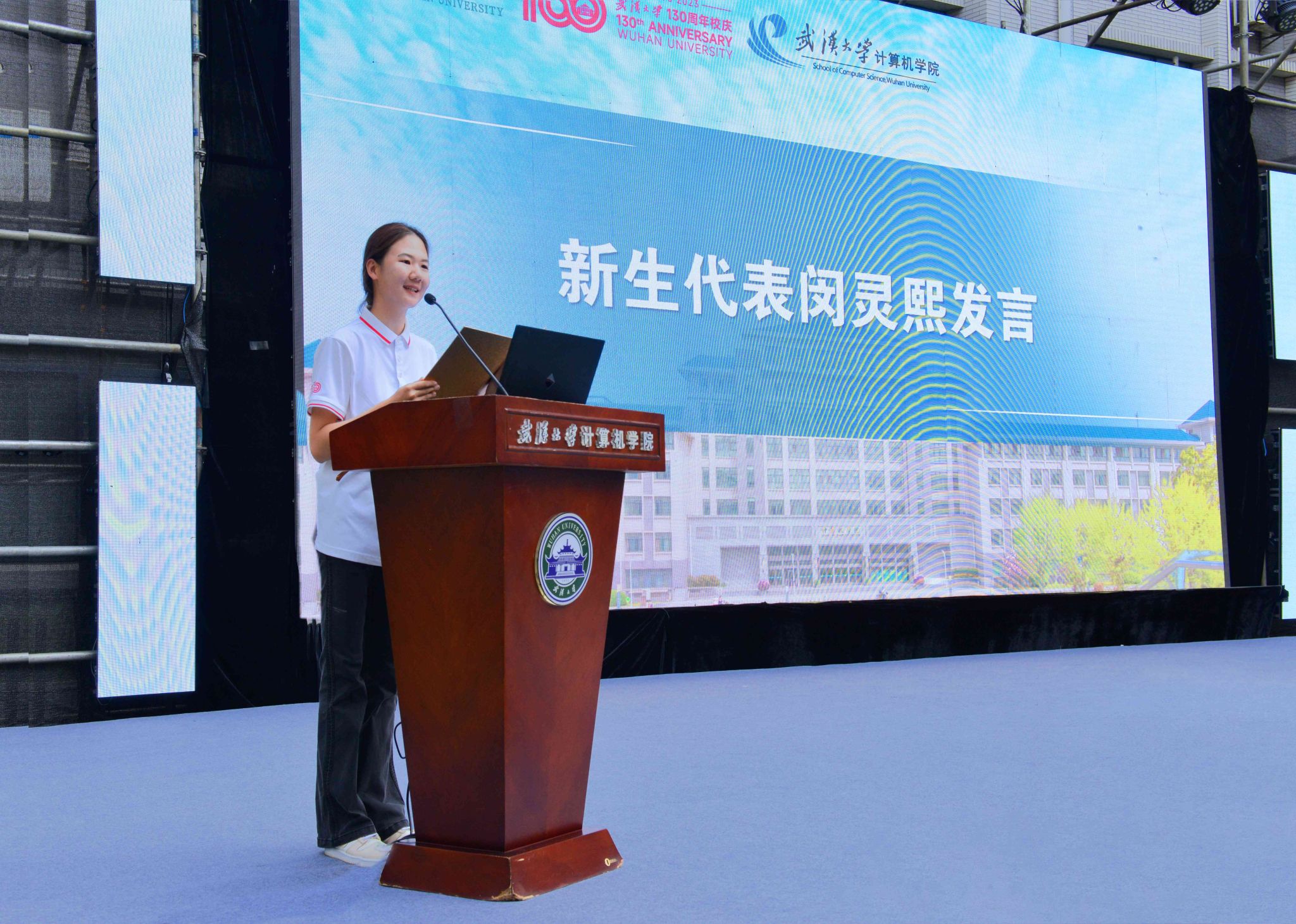 活动第三项,2023级本科新生代表闵灵熙同学发言。闵灵熙同学表达了自己对科技和创新的理解与思考,号召同学们共同传承属于计算机学院的珞珈星火,在科技自立自强的无限征途中不懈奋斗,担当属于青年的光荣使命。同时也呼吁同学们在探索计算机技术的过程中不忘感受美、探寻美、追求美,让技术也能充满温度与情怀。
