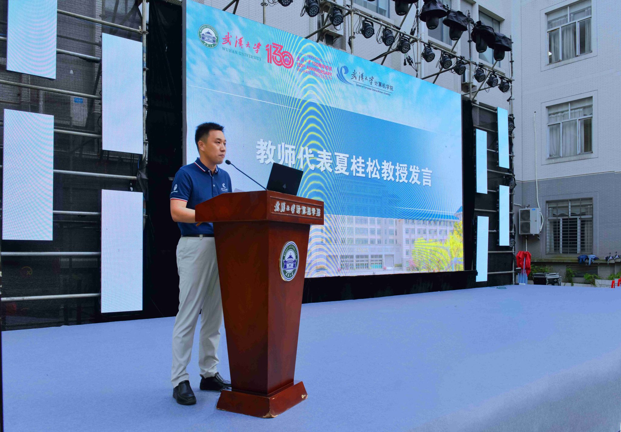 活动第一项,学院教师代表夏桂松教授发言。夏桂松教授向同学们分享了几点感悟,帮助新生从高中迈向大学——抽丝剥茧、反复锤炼,搭建知识架构,培养科学思维;自控自立、自我管理,确立目标,跳出舒适圈。“不恋过往、不惧将来、不负当下”,夏桂松教授鼓励新生们在最美大学、在计算机学院感受大学生活,充实求学之路。
