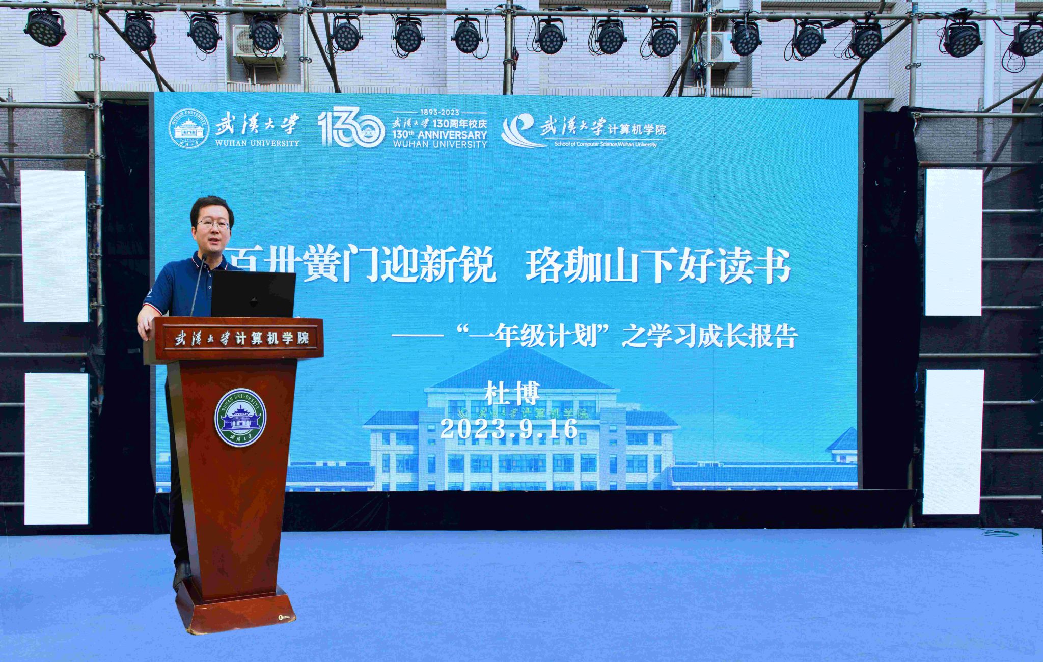 活动第六项,院长杜博教授为新生作“一年级计划”之《百卅黉门迎新锐,珞珈山下好读书》学习成长报告,介绍了计算机学科的特点和学院基本情况。丰富的图文解说和生动的应用案例向新生呈现出有料、有趣、有前途的计算机学科;厚积薄发的大院、精英荟萃的师资、蓬勃发展的势头展现的是计算机学院的专业实力和科研前景。幽默风趣的分享引起了同学们的共鸣。杜博教授还重点介绍了专业培养特色,鼓励学生量力行、敢创新、求上进,并寄语新生学会自立,做到自律,奋发自图强,“登陆现在,点击未来,放飞梦想,超越自我”。