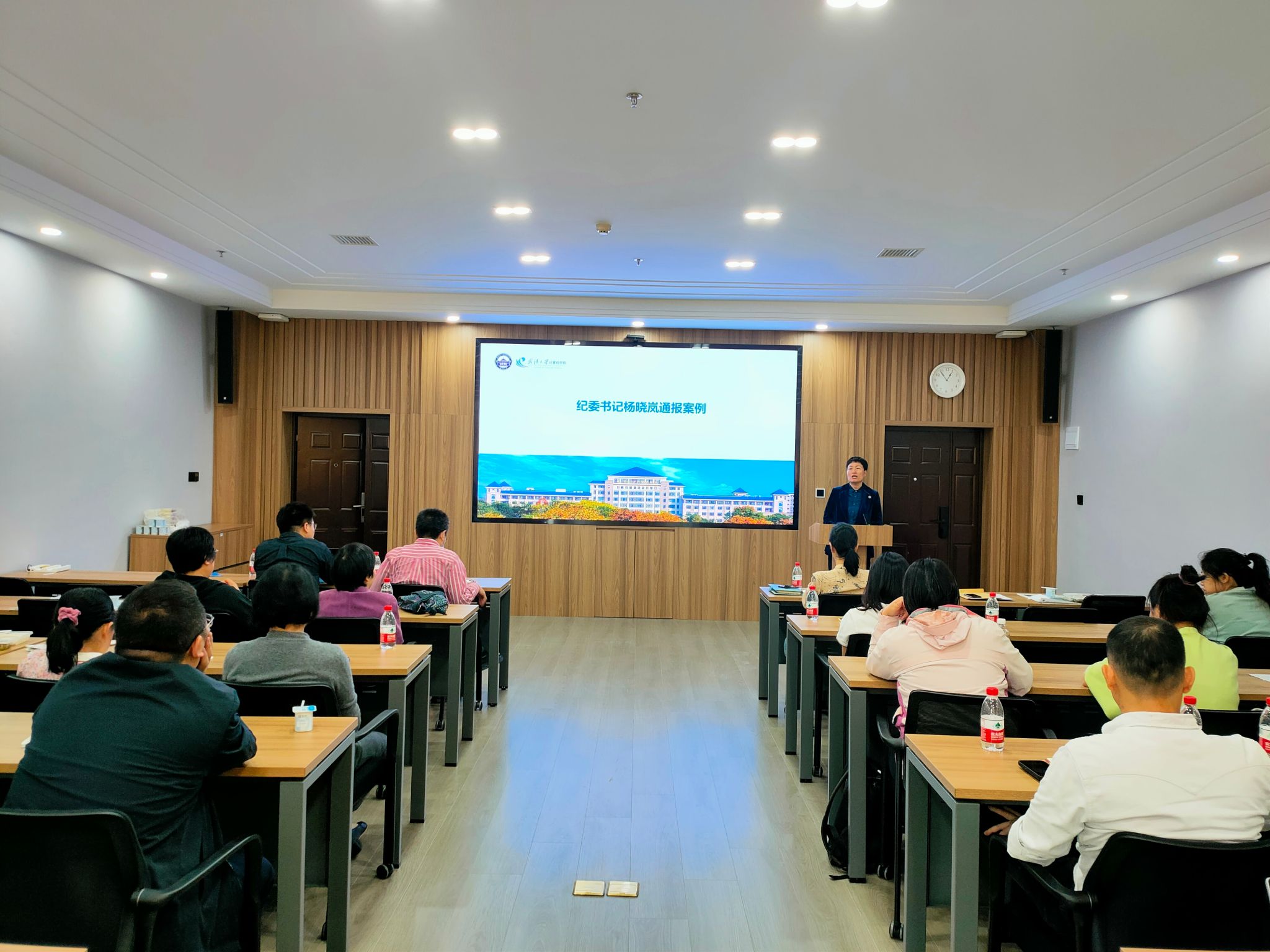纪委书记杨晓岚通报了学校查处、通报的案例,以及发生在学院的案例。案例讲解透彻,为大家消除了一些认识上的盲区、思想上的误区,让大家知敬畏、存戒惧、守底线,以案为鉴,警钟长鸣,自觉增强不敢腐、不能腐、不想腐的意识,提高拒腐防变能力。