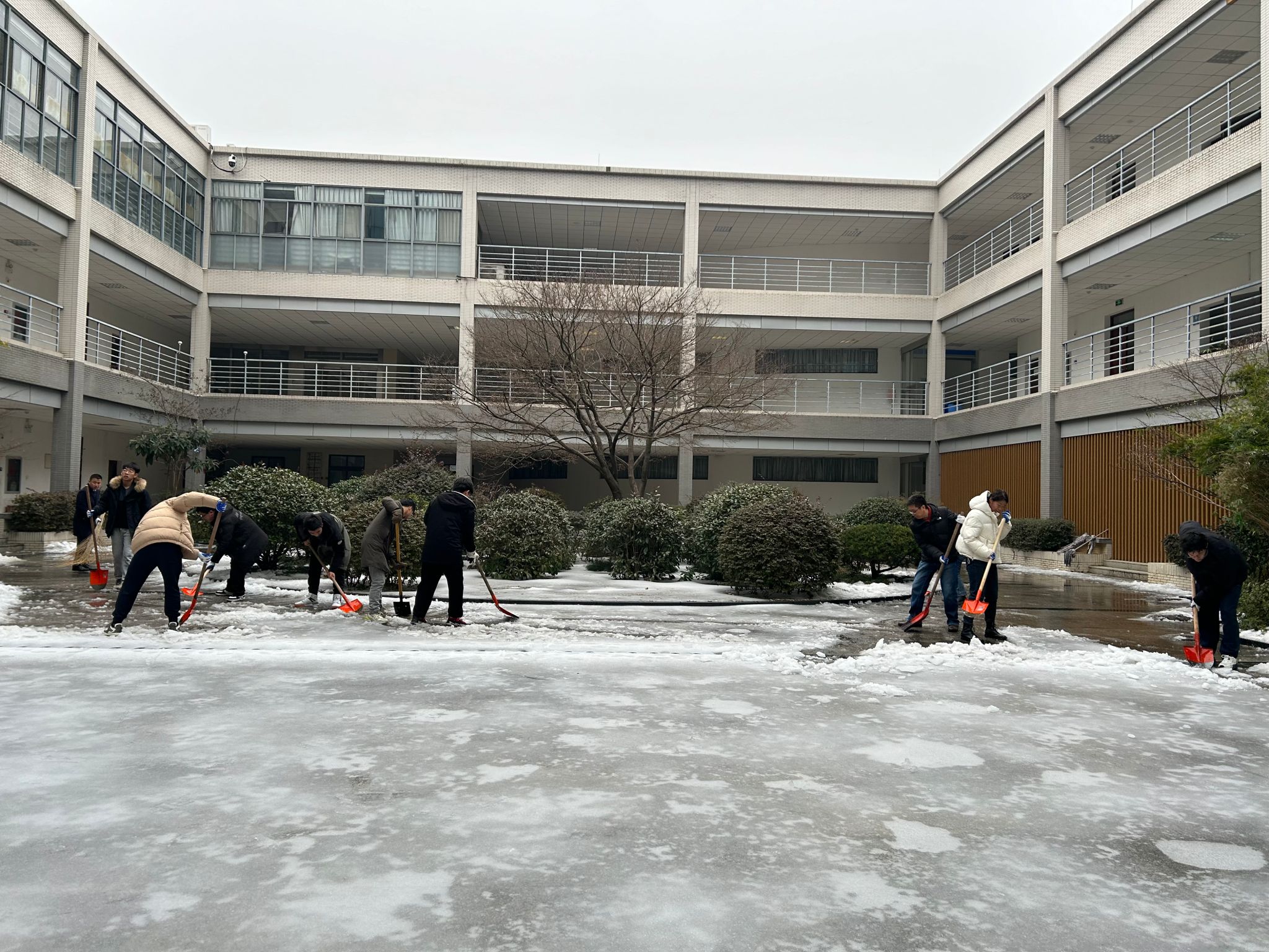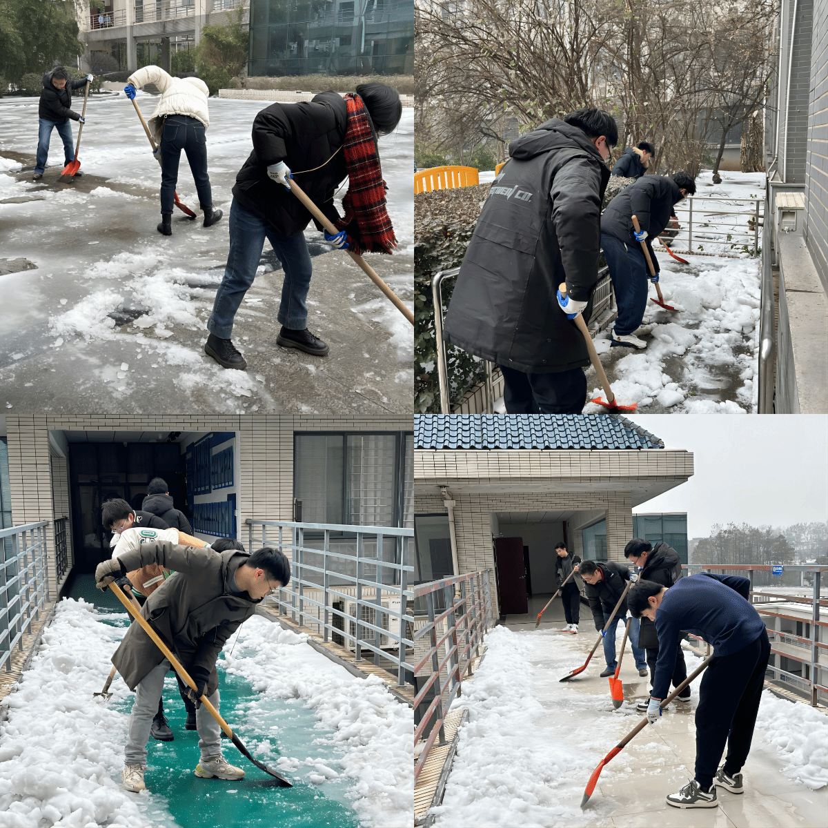 开辟通路,不畏严寒勇担当。志愿者们手握铁锹、大力挥舞,敲、推、铲、扫,铲冰层、去路障、清积雪,行动有序、密切配合,成为冬日校园里一道温暖亮丽的风景线。铁铲、扫帚与地面的摩擦声此起彼伏,既奏出了一首“铲冰除雪进行曲”,也铺筑了一条平安通行的暖心路。经过2小时的浴“雪”奋战,学院大楼区域的积雪和暗冰堆积情况得到大幅度缓解,皑皑白雪之中开辟出一条条“安全通道”。