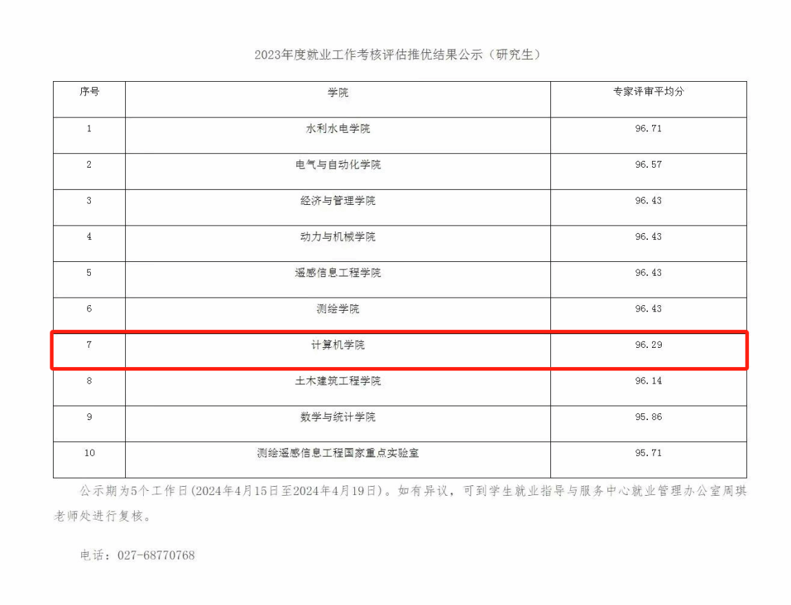 根据武汉大学学生就业指导与服务中心公布的2023年度就业工作考核评估结果,经各培养单位自评和学校复查审核、考评结果排序、校内外评审专家评审、就业指导与服务中心公示,计算机学院研究生就业工作获评2023年度就业工作考核评估“优秀”。