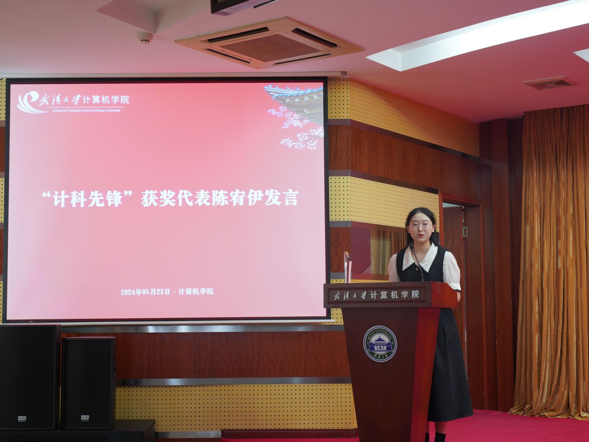 “以勇敢为牵引,收获直面困难、挑战自我的信心”,第二届“计科先锋”学生年度人物获得者、2022级硕士研究生陈宥伊作为获奖代表,从勇于尝试砥砺坚持、积极探索克服困难、服务同学共同进步三个维度,分享了自己的成长之路。面对转专业后专业知识和能力的欠缺、面对思索未来发展方向时的迷茫无措,她以勇气为引,在学术、实践等多个领域坚定信念、努力奋进,成为当之无愧的计科榜样。