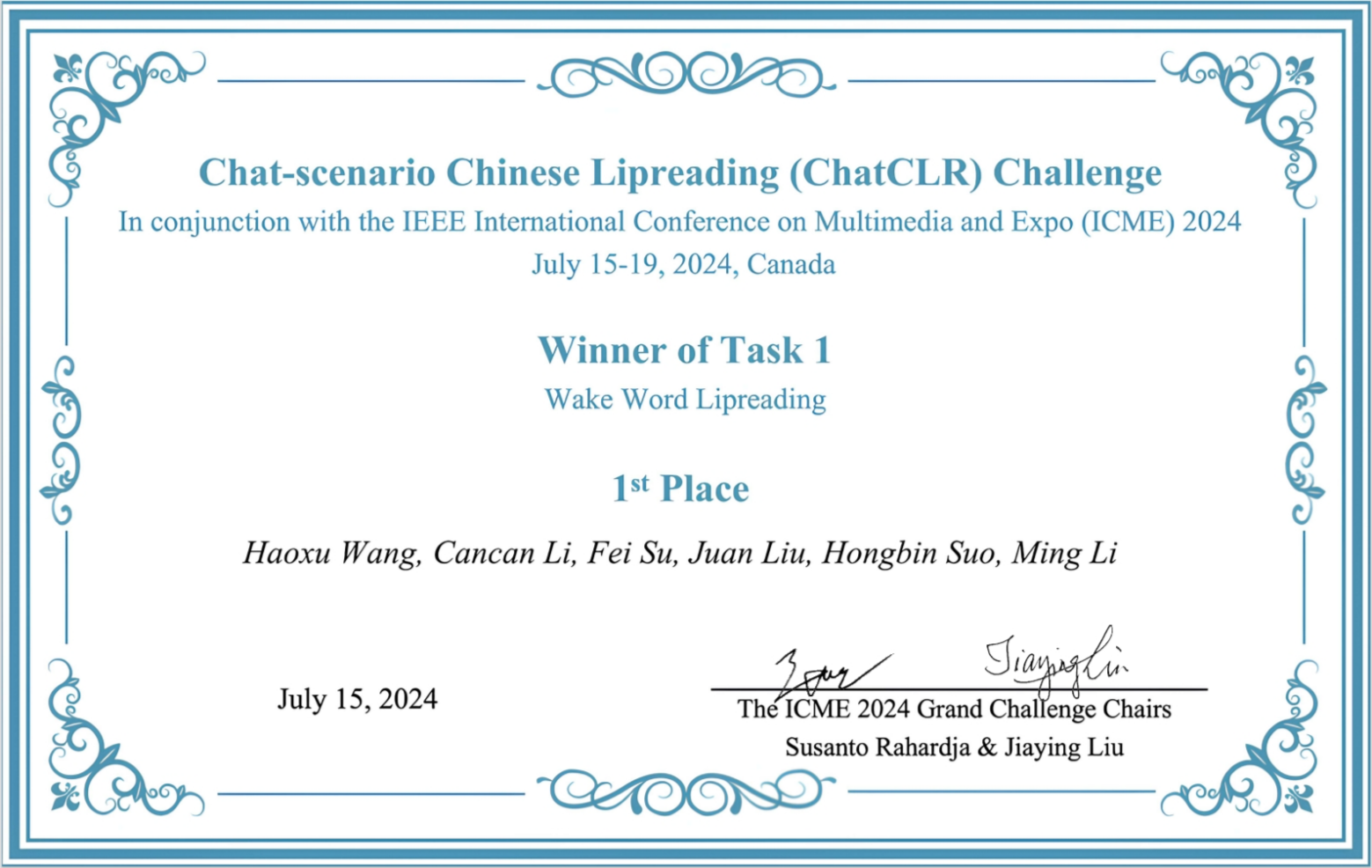 2024年1月至4月,IEEE ICME 2024挑战赛—中文对话场景唇读比赛(ChatCLR)顺利举行,K体育·(sports)官方网站研究生团队以第一名的优异成绩荣获“唤醒词唇读”赛道一等奖。参赛团队学生成员包括2021级硕士生王浩旭、2024级硕士生李灿灿、2023级博士生苏菲,团队指导教师为K体育·(sports)官方网站刘娟教授、昆山杜克大学李明教授(武汉大学兼职教授)。此外,来自OPPO的语音技术专家索宏彬博士也给予了技术指导。
