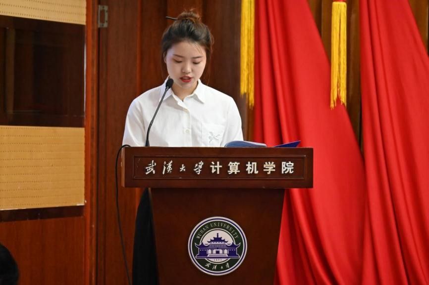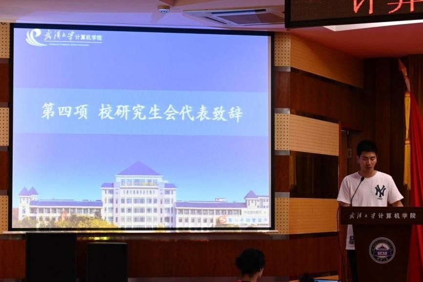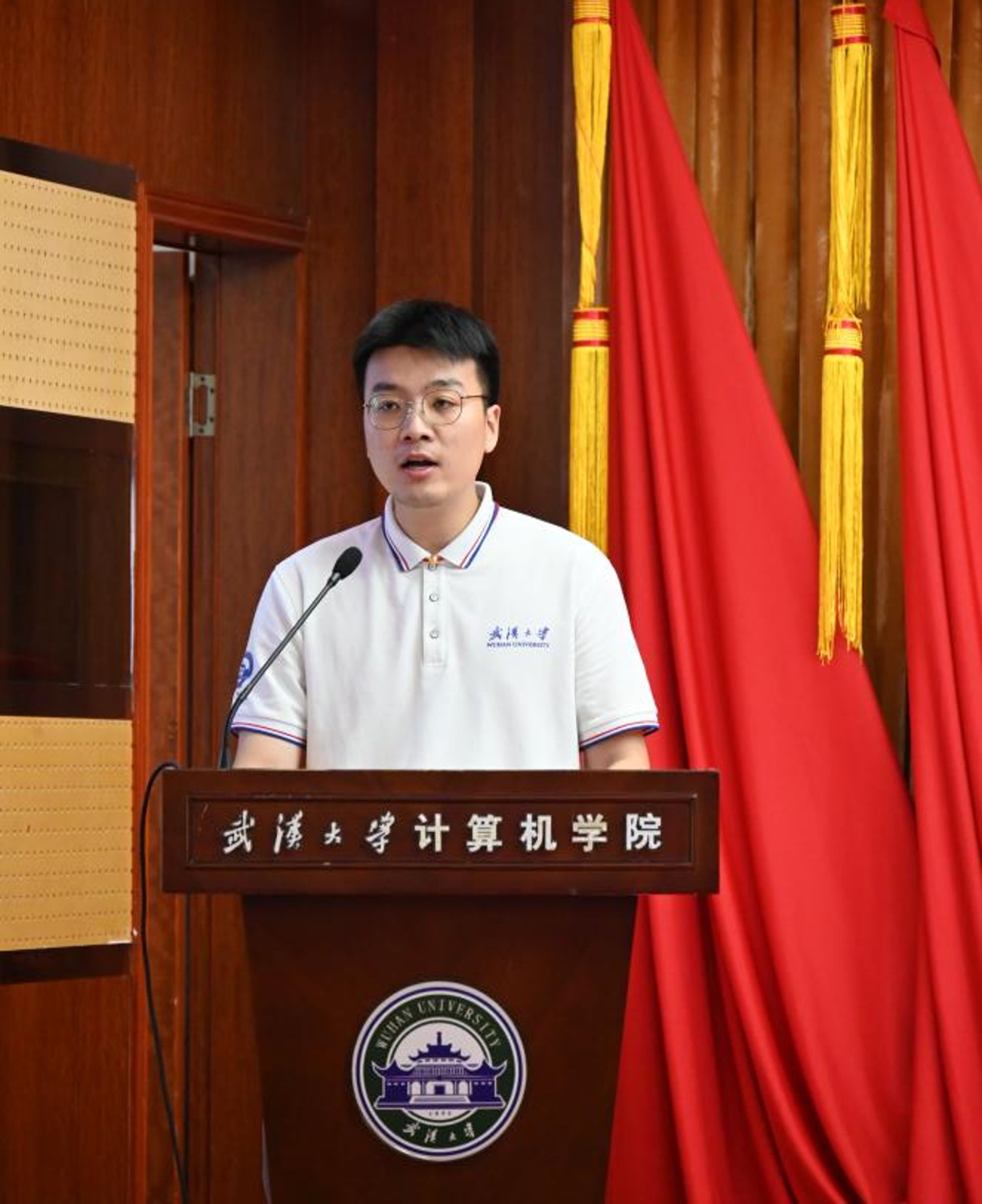 大会第四项,校研究生会代表、武汉大学研究生会主席团成员邓力铭进行致辞。他表示,计算机学院研究生会在过去的一年里团结带领广大同学,立足学科特色,在服务凝聚广大同学方面做出了许多突出的贡献。邓力铭特别强调,计算机学院研究生会结合学院的工作重心,秉承全心全意为学生服务的宗旨,基于微信公众号“E海扬帆”和QQ账号“计小研”等传播载体,打造了系列精品活动,展现计科青春风采,基本形成了重点突出、全局并进的良好势头。邓力铭还将自己在研会工作中的感悟与大家做出分享:要提高政治站位,重视思想引领;要明确服务定位,聚焦主责主业;要营造良好作风,明确责任担当。邓力铭希望计算机学院研究生会能凝心聚力、创新发展,将研会打造成“谋需求、聚合力、育英才”的先进学生组织。