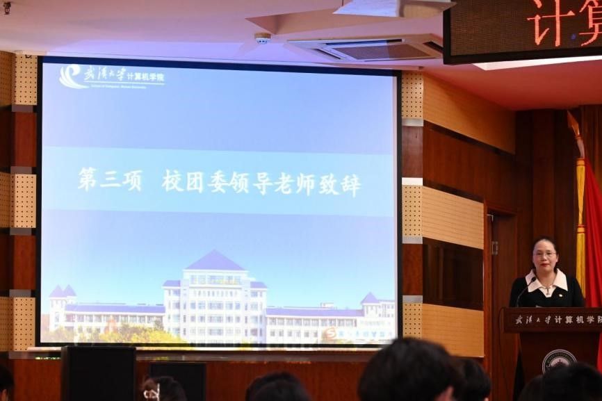 大会第三项,校团委副书记伍林老师进行致辞,她表示,在过去的一年里,计算机学院研究生会围绕中心、服务大局,在当好桥梁纽带、引领凝聚青年、服务学生成长、深化自身改革发展等方面开展了一系列卓有成效的工作。伍林代表校团委向新一届的研究生会提出了三点希望:其一,聚焦主责主业,强化政治能力,以思想政治的引领为根本,认真服务同学成长成才,坚持用党的科学理论武装头脑,用党的初心使命感召同学;其二,践行服务宗旨,当好桥梁纽带,既要依托学科优势,精准把握研究生的群体特点,打造计院品牌,也要用满腔的热情,把服务青年的工作做细做实;其三,要勇于自我革新,持续深化改革,坚持全面从严治会,把同学的满意度做作为检验工作的重要标尺,继续优化体制机制建设,强化校、院、班三级联动的工作模式,形成组织合力。