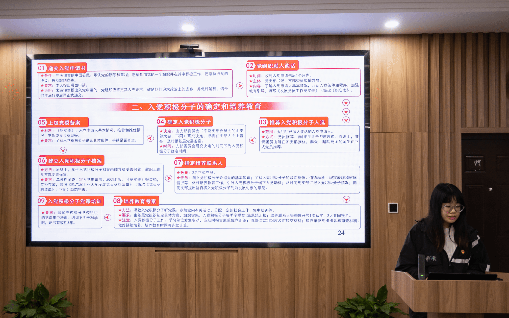 会议第三项,党总支党员发展办公室曾思绮作“党员发展工作流程”专题培训。曾思绮同志详细讲解了发展党员的各个关键阶段,并详细阐述了发展对象的考察和培养过程中的注意事项。她从申请入党、确定积极分子、发展对象、预备党员接收直至转正的整个过程进行详细讲解,并结合党员档案核查过程中发现的具体问题强调了材料规范填写的重要性。