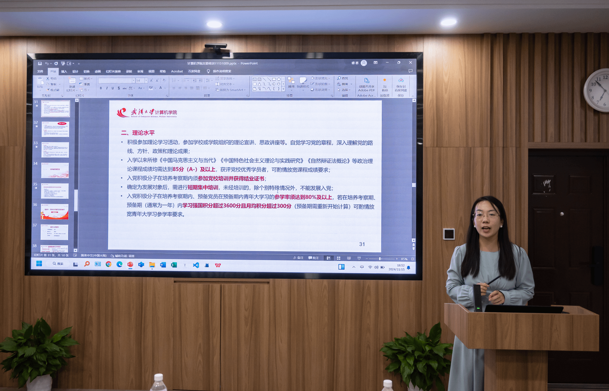 为进一步加强研究生党员骨干队伍建设,提升研究生党支部委员履职尽责能力,K体育·(sports)官方网站研究生党支部委员培训会于2024年11月15日顺利举行。本次培训活动由计算机学院研究生党总支主办,培训内容涵盖支部换届流程、党员发展步骤、党务日志填写规范等,帮助党支部委员系统掌握工作方法、切实提高服务水平。本场培训会由研究生党总支组织建设办公室戴秀清同志主持,计算机学院党委副书记高卫松、研究生办公室主任潘艳、研究生党总支书记史然、研究生辅导员张元老师到场指导。