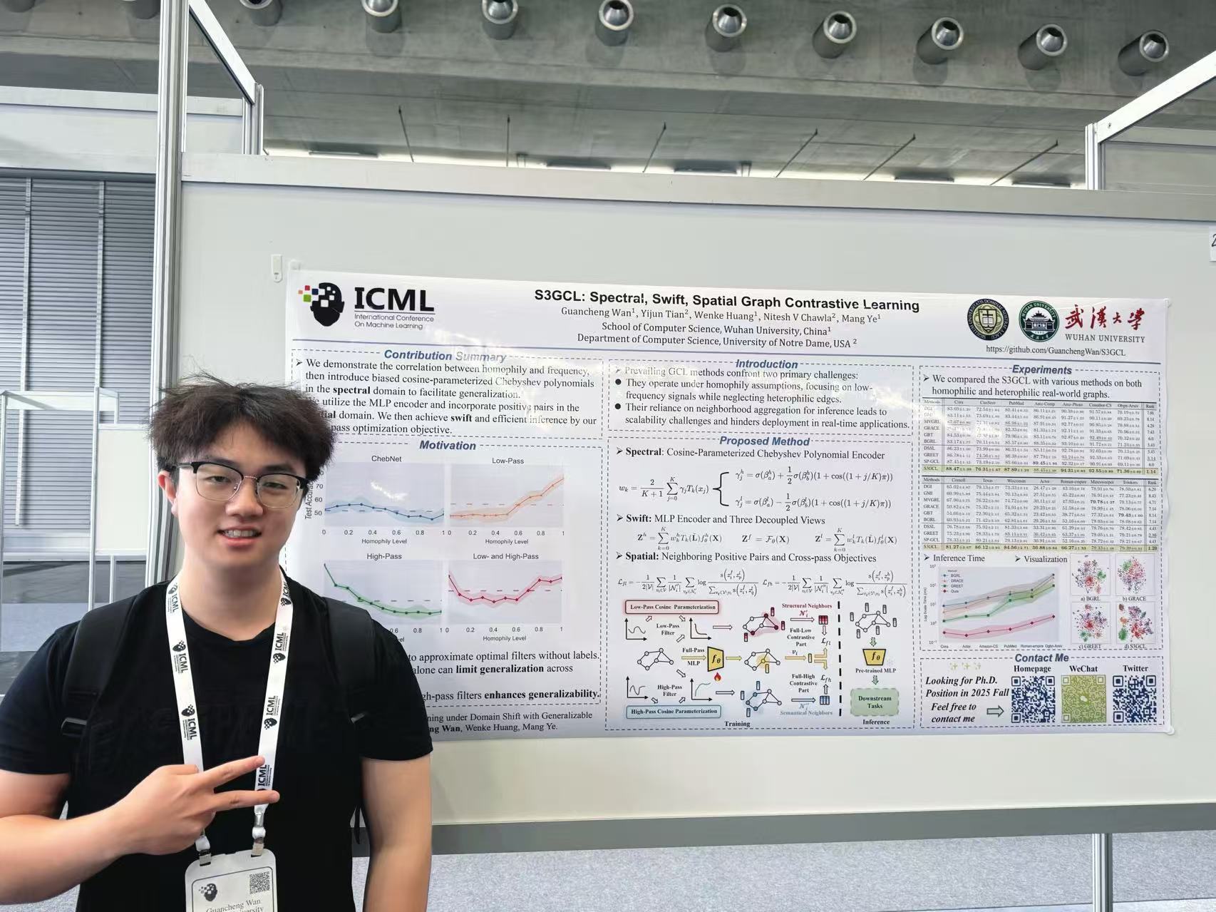 在学术研究方面,万冠呈在国际顶级会议和期刊、计算机领域最高评级(CCF-A类)发文7篇,包括SCI1区IEEE TPAMI,人工智能顶会ICML和NeurIPS等等,其中第一/共一作者5篇,谷歌学术引用目前累计126次。学术成果得到了新加坡工程院士、加拿大两院院士、麻省理工学院教授等充分肯定,相关事迹登上武大学工部、武大招生办等官号。此外,他以学生一作公开2项国家发明专利,深入参与多项国家自然科学基金基础研究项目并发表论文。他还作为国家级大创主要负责人,主持首批珞珈本科生研究基金项目。他得到国际同行认可,受邀担任ICLR、CVPR等人工智能顶会程序委员,担任SCI1区期刊TIFS、TKDE等审稿人。代表武汉大学参与多次国际会议,包括维也纳ICML 2024、巴塞罗那KDD 2024、澳门IJCAI 2023。以海报和口头汇报方式介绍学术成果,组织学术研讨会,在国际舞台上传递武大声音。