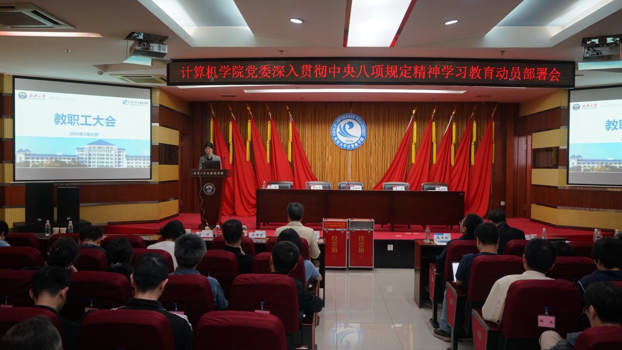 2025年3月25日上午,计算机学院在八楼报告厅召开全院教职工大会,传达学习中央有关精神,部署深入贯彻中央八项规定精神学习教育,并开展警示教育。计算机学院及人工智能学院全体教职工参会,计算机学院党委副书记金娟主持。