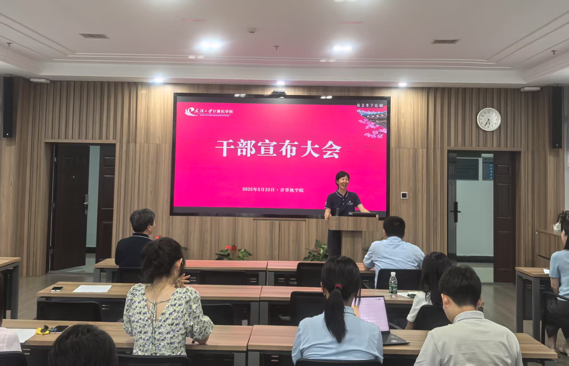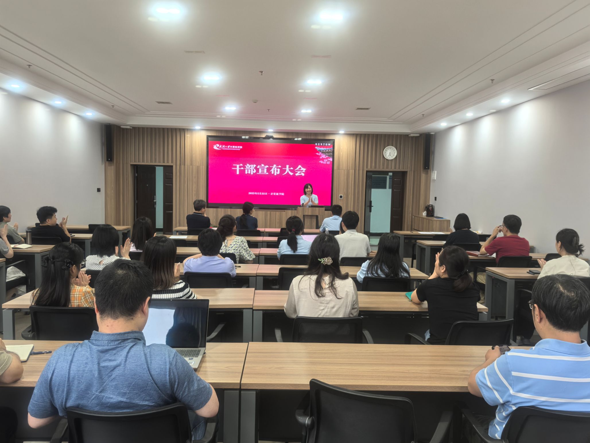 2025年5月22日下午,学院在B404会议室召开干部任职宣布会。院领导班子、系、中心党支部委员、副主任以上干部、教职工代表及办公室党政管理人员等参会。会议由党委副书记金娟主持。
