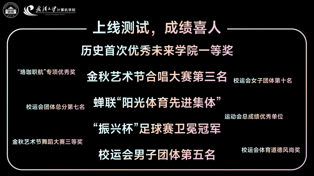 以文体活动为载体,倾力绘制青年成长的“青春 UI 界面”。“计往开来·码到成功”迎新晚会打造入学“欢迎界面”,民族文化节、春日音乐节、随机舞蹈等多元活动持续释放青春活力,营造沉浸式文化体验;构建“多端体育互动平台”,策划“院运会”“珞珈周跑”及多项球类赛事,激发运动热情,增强凝聚力。金秋艺术节捷报频传,合唱大赛获第三名、舞蹈大赛获三等奖,尽展艺术风采;积极融入校级“联机项目”,斩获“振兴杯”冠军、羽毛球团体第二、校运会男子团体第五,充分展现团体协作力与竞技实力。
