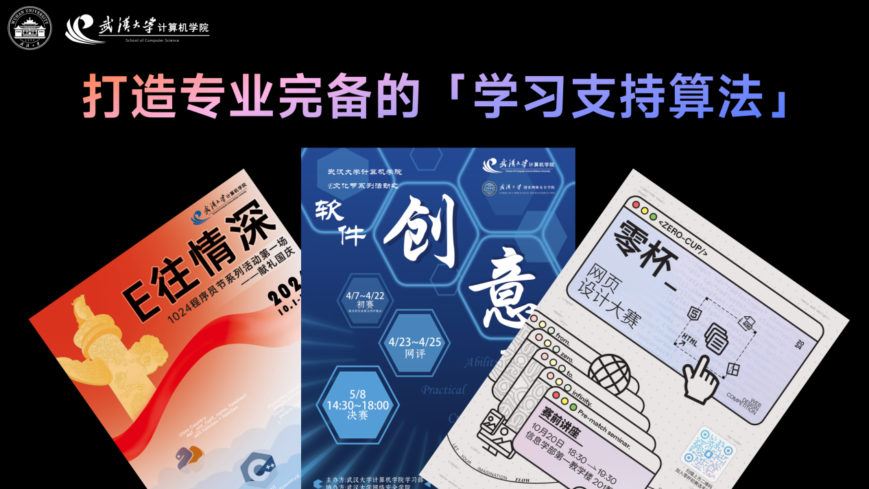 以“学习支持算法”为核心架构,持续推动品牌活动与学风建设迭代升级,打造专业扎实、氛围浓厚、机制完善的学习生态。第二届“1024程序员节”推出国庆专版“四行代码写情诗”,以技术表达深情,献礼祖国;第24届“E文化节”汇聚300余人共襄软件创意大赛,激发无限想象;“零杯”网页设计大赛联合多院联动,助力技术成长路径从“零”启航。依托朋辈引领机制,常态化开展“雷锋助学”活动,覆盖十余门核心课程,服务180余人次;图灵读书会与助教制度“双线并进”,构筑多层次、多主体协同共育的优良学风体系。