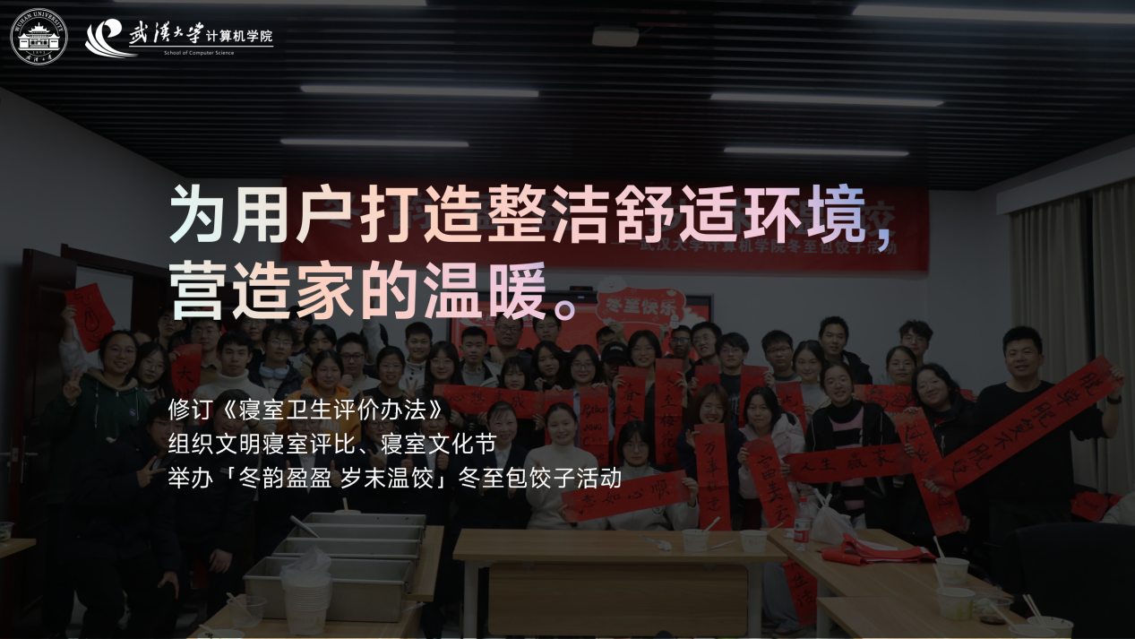 坚持“服务同学”核心导向,构建高响应度服务体系。通过修订《寝室卫生评价办法》、举办文明寝室评比与寝室文化节,实现制度规范与文化育人同频共振;在冬至开展暖心「冬韵盈盈 岁末温饺」包饺子活动,以细节传递温度,营造如家氛围。不断迭代“计院小权益”服务端口,双平台推送生活内容146篇,覆盖访客9万余人,构建高可用、低延迟的智能服务网络。依托“一站式学生社区”,开展“院领导接待日”“师生座谈会”等活动,形成“收集—分析—响应”闭环,推动服务模式由被动响应向主动感知跃升。