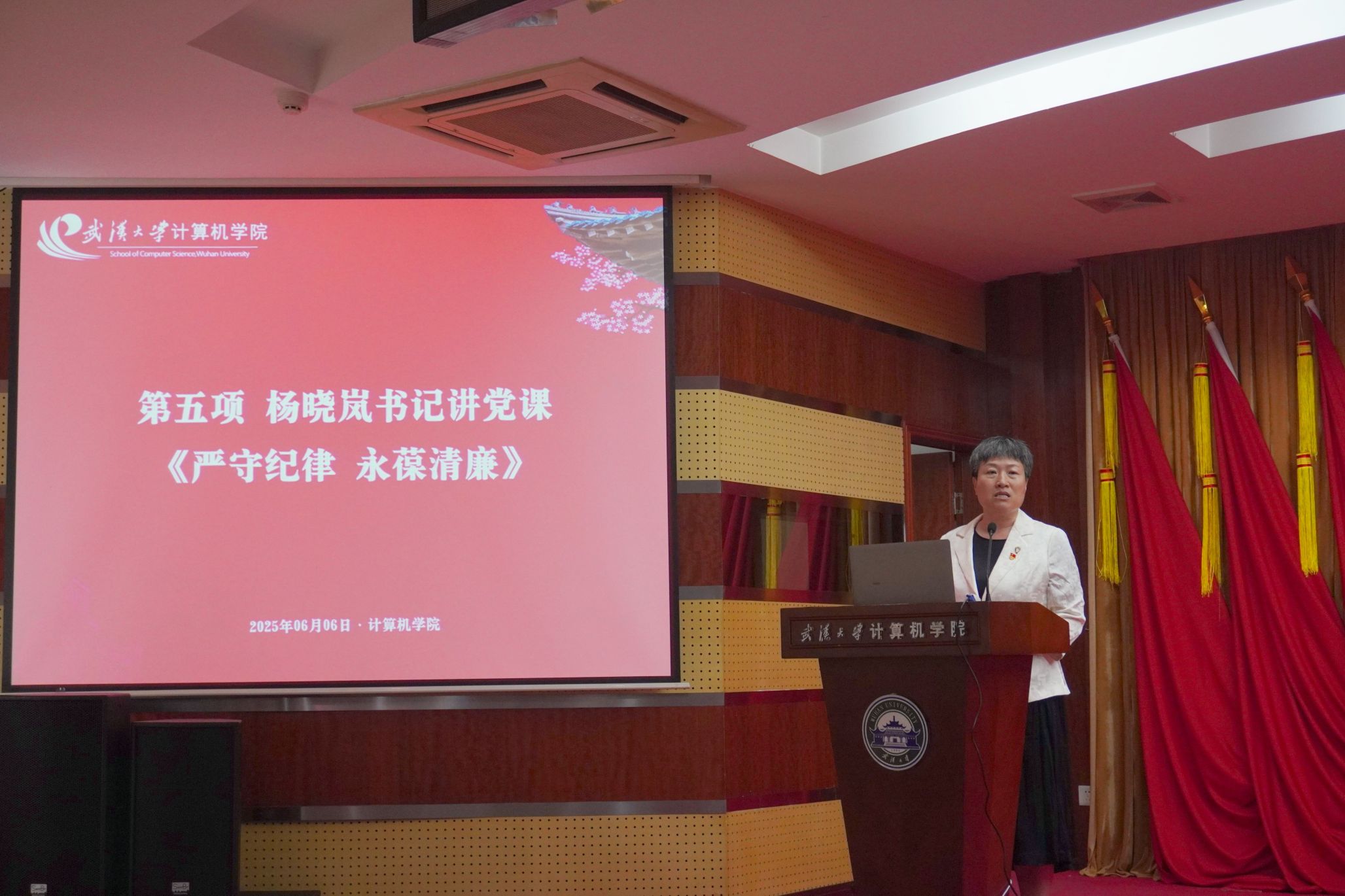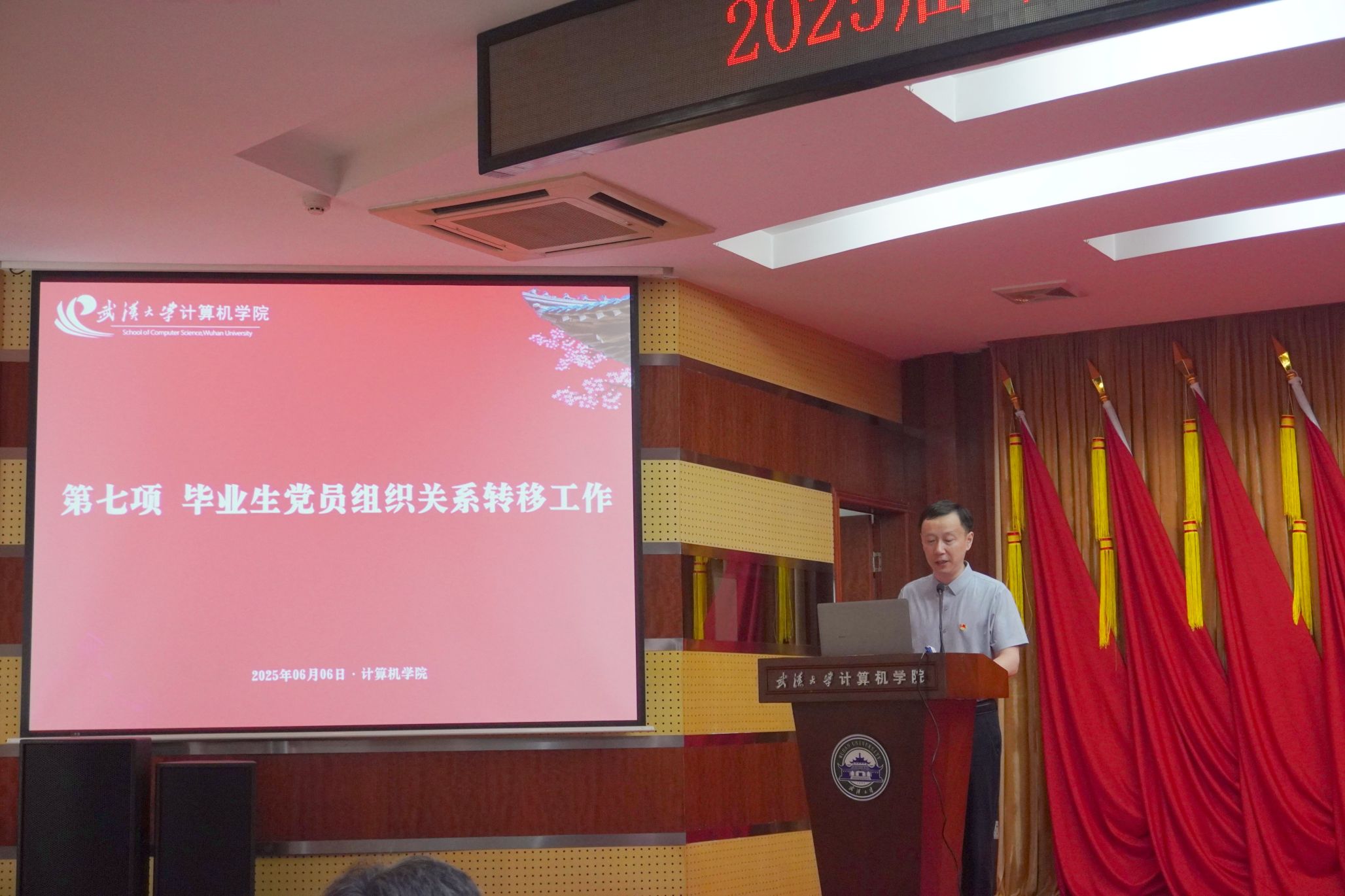 为推动深入贯彻中央八项规定精神学习教育走深走实,践行总书记给武汉大学参加中国南北极科学考察队师生代表的重要回信精神,激励毕业生党员和新党员坚定理想信念、厚植爱国情怀,6月6日下午,计算机学院在八楼报告厅举行2025届毕业生党员最后一堂党课暨党员教育大会。学院党委书记边金鸾、党委副书记陈琛、纪委书记杨晓岚、党委组织员傅杰、本科生辅导员于雅梦、胡仲淹、孙春鹏、马雨聪,研究生辅导员史然、张元以及全体本、硕、博毕业生党员齐聚一堂,在庄严的国歌声中开启这场离校前的党性锤炼课。本次教育大会由陈琛主持。