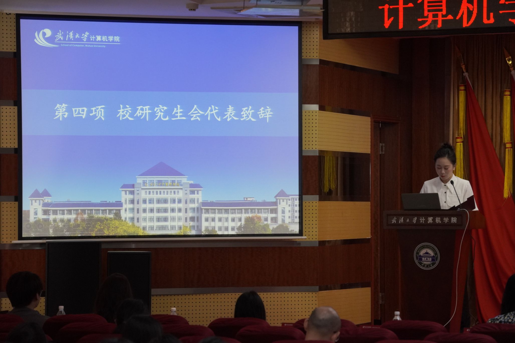 校研究生会代表付润雨对计算机学院第二十五次研究生代表大会的召开表示祝贺,她指出,在学院党政领导的关怀指导下,研究生会团结带领广大同学立足学科特色,聚焦同学实际需求,打造了“通往卓越之路”、“学以载道,诚信为本”等多项特色品牌活动,营造浓厚学术氛围,为学子全面发展做出贡献。发言人提出了三点学习感悟:一是以习近平新时代中国特色社会主义思想武装头脑指导实践,坚定理想信念;二是围绕服务同学成长成才这一主线,规范有序开展工作;三是在服务中引领同学,为学校“双一流”建设和国家发展贡献力量。付润雨勉励研究生骨干在为同学谋需求、为学校聚合力、为国家育英才的征程中踔厉奋发,勇毅前行,做有理想、敢担当、能吃苦、肯奋斗的新时代好青年。