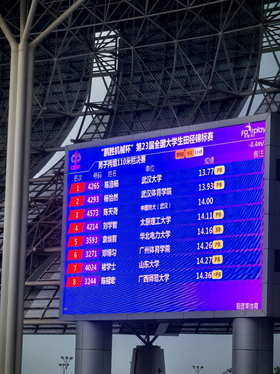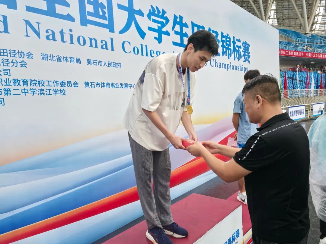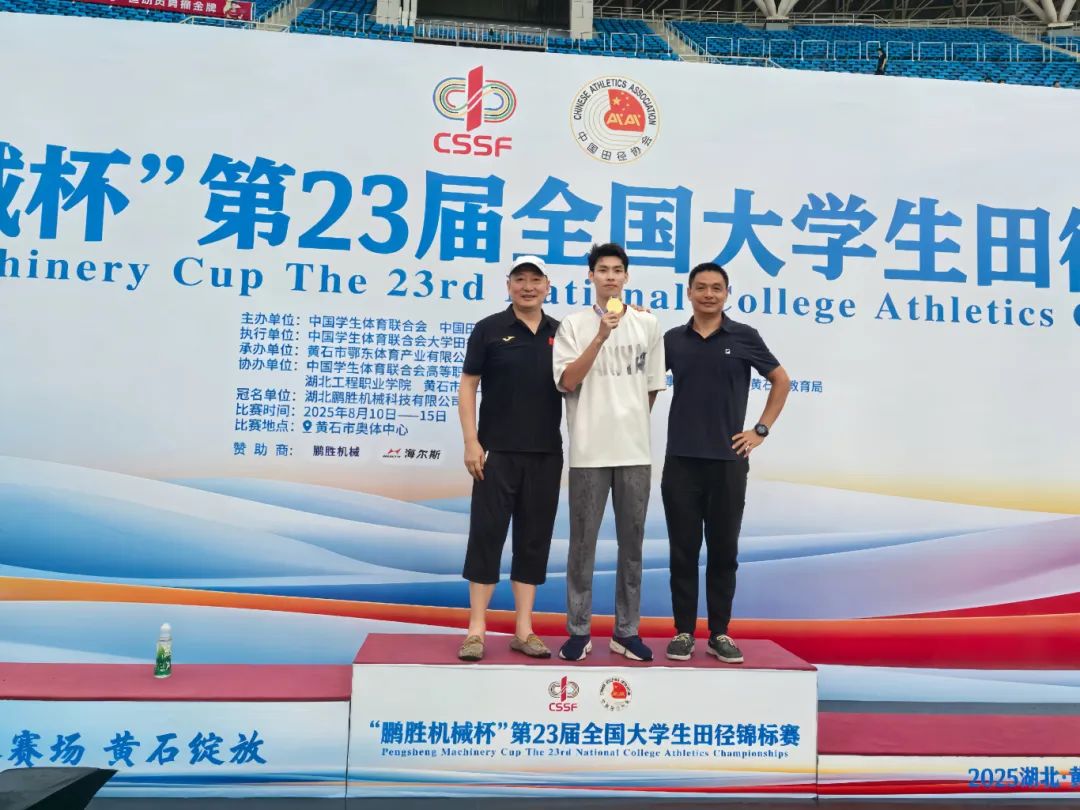 2025年8月10日至8月15日,第23届全国大学生田径锦标赛在湖北黄石奥林匹克体育中心燃情开赛。来自全国490所高校的3640余名运动健儿齐聚一堂,在27个大项、161个小项中展开激烈角逐。武大田径队高水平运动员、计算机学院2023级本科生陈浩杨凭借强大的实力水平和顽强的拼搏精神,在男子丙组110米栏项目中一骑绝尘,斩获金牌,闪耀赛场,为学校、学院赢得荣誉。