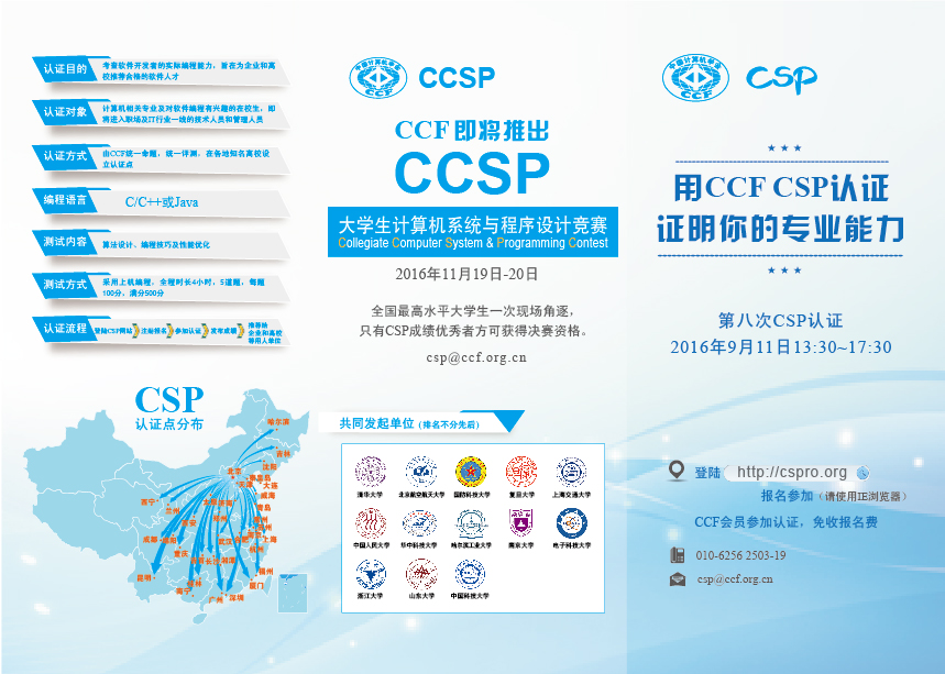 8、如果您有什么疑问或在报名过程中遇到任何问题,请发送电子邮件至csp@ccf.org.cn或在工作日拨打电话与CCF CSP认证中心联系,相关工作人员将为您提供咨询服务,联系电话:010-62562503-19。